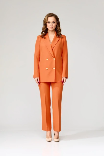 Комплект состоит из жакета и брюк. Жакет свободного силуэта, с двубортной с застежкой на четыре пуговицы. Полочки с отрезными бочками, с нагрудной вытачкой из горловины закрытой лацканом. Спинка со средним швом и двумя отрезными бочками. Рукав двухшовный втачной. Жакет на подкладке. Брюки прямые к низу. Верх брюк на поясе со шлевками. Застежка гульфик на молнии. Фурнитура может быть изменена. Длина жакета 72 см, рукава - 60 см, брюк - 101см.