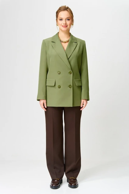 Жакет свободного силуэта, с двубортной с застежкой на четыре пуговицы. Перед с рельефом, с нагрудной вытачкой из горловины. По переду настрочены декоративные клапаны. Спинка со средним швом и рельефами. Рукав двухшовный втачной. Жакет на подкладке.