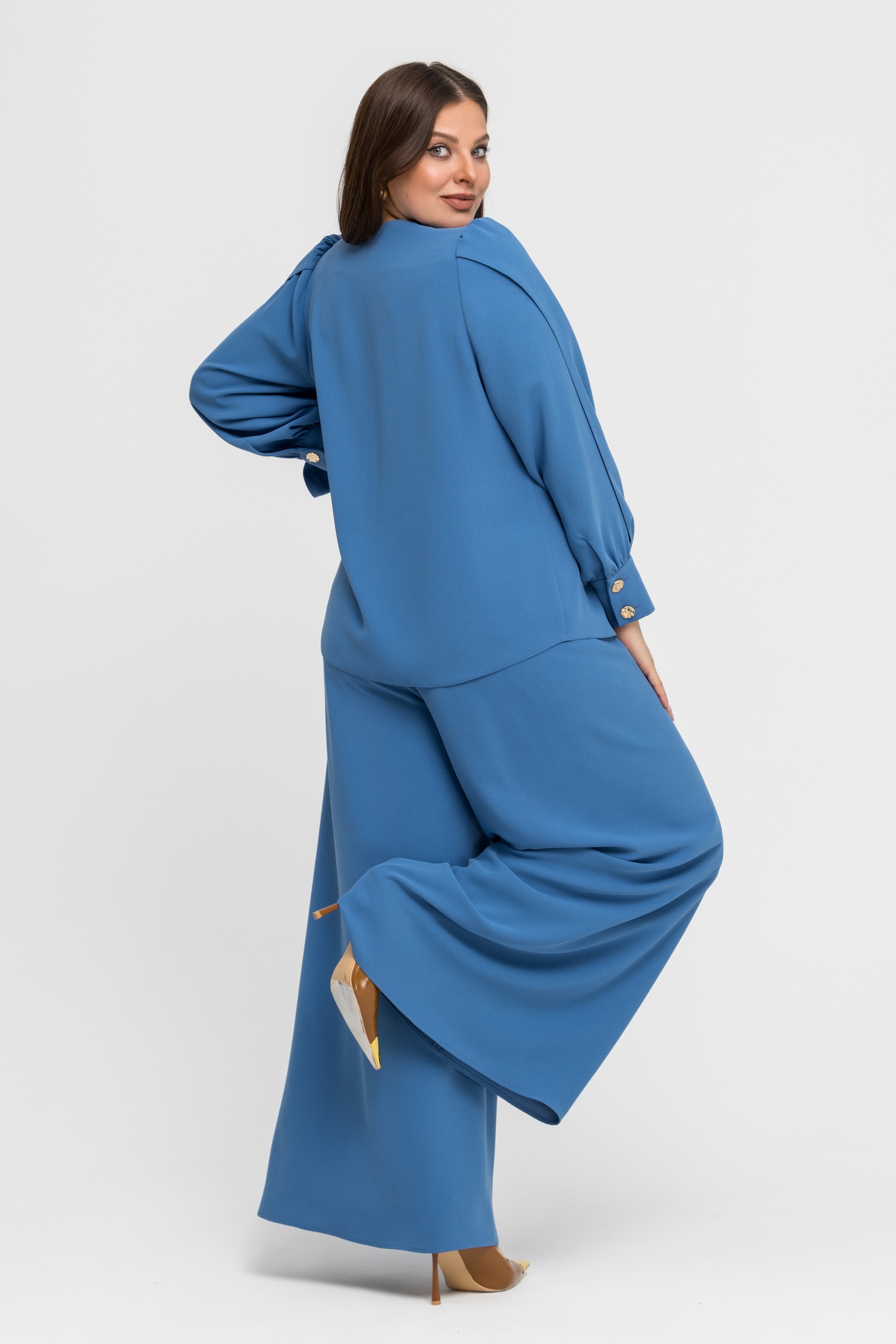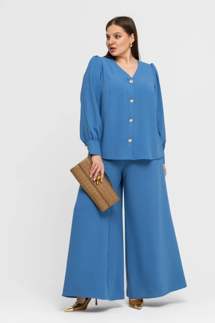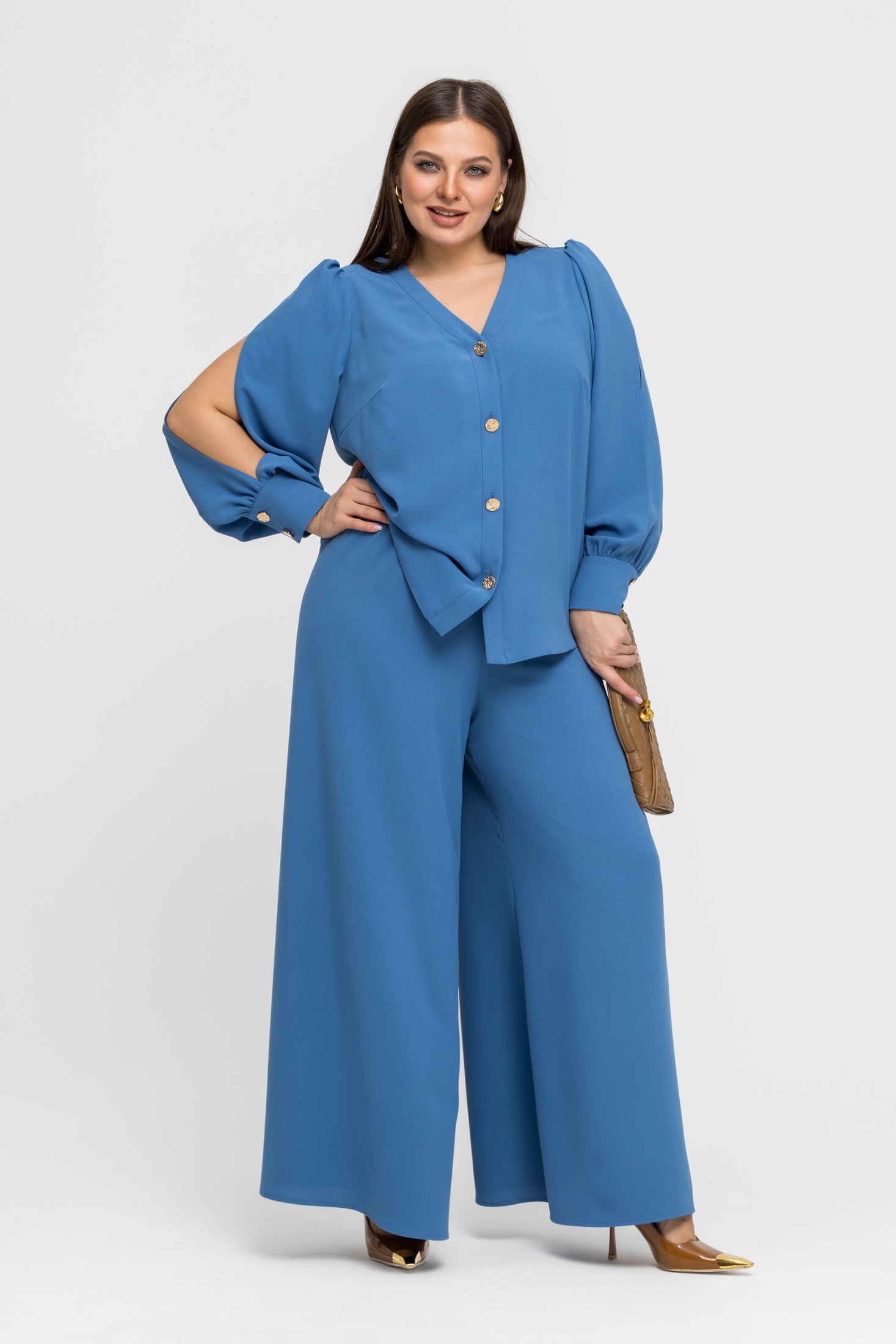 Костюм брючный 25С2762 темно-голубой Gold Style — это воплощение стиля и комфорта. Коллекция бренда Gold Style представлена элегантным комплектом с блузкой и широкими брюками. Выполнен из смеси полиэстера и вискозы с полиэстеровой подкладкой, обеспечивающей длительную носку и лёгкость ухода. Костюм отличается классическим фасоном, с акцентом на пуговицы, придающими образу изящность. Идеально подходит для весенне-осеннего сезона благодаря воздушной и комфортной ткани. Глубокий темно-голубой цвет добавляет изысканность и универсальность, делающую костюм подходящим для офисных будней и официальных мероприятий.