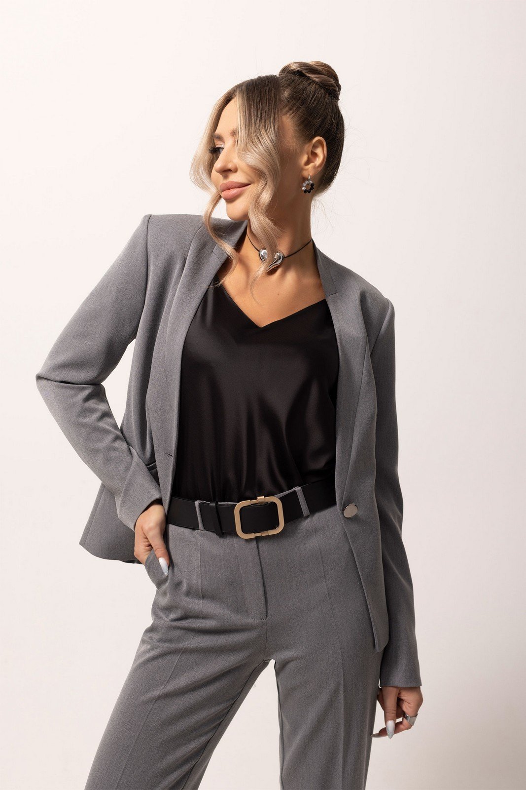 Брюки с отрезным поясом на один брючный крючок и потайную пуговицу, застежку-гульфик. Передние половинки с карманами, наклонными к боковому шву и бочком-подзором. Задние половинки с вытачками и прорезными карманами с листочкой. Брюки со стрелками и настрочными шлевками.Жакет и брюки выполнены из эластичной ткани одного вида. Фурнитура металлическая (черненый никель). Все отделочные строчки выполнены в тон основной ткани. Подкладка жакета - контрастный жаккард с рисунком. Длина изделия: 61 см