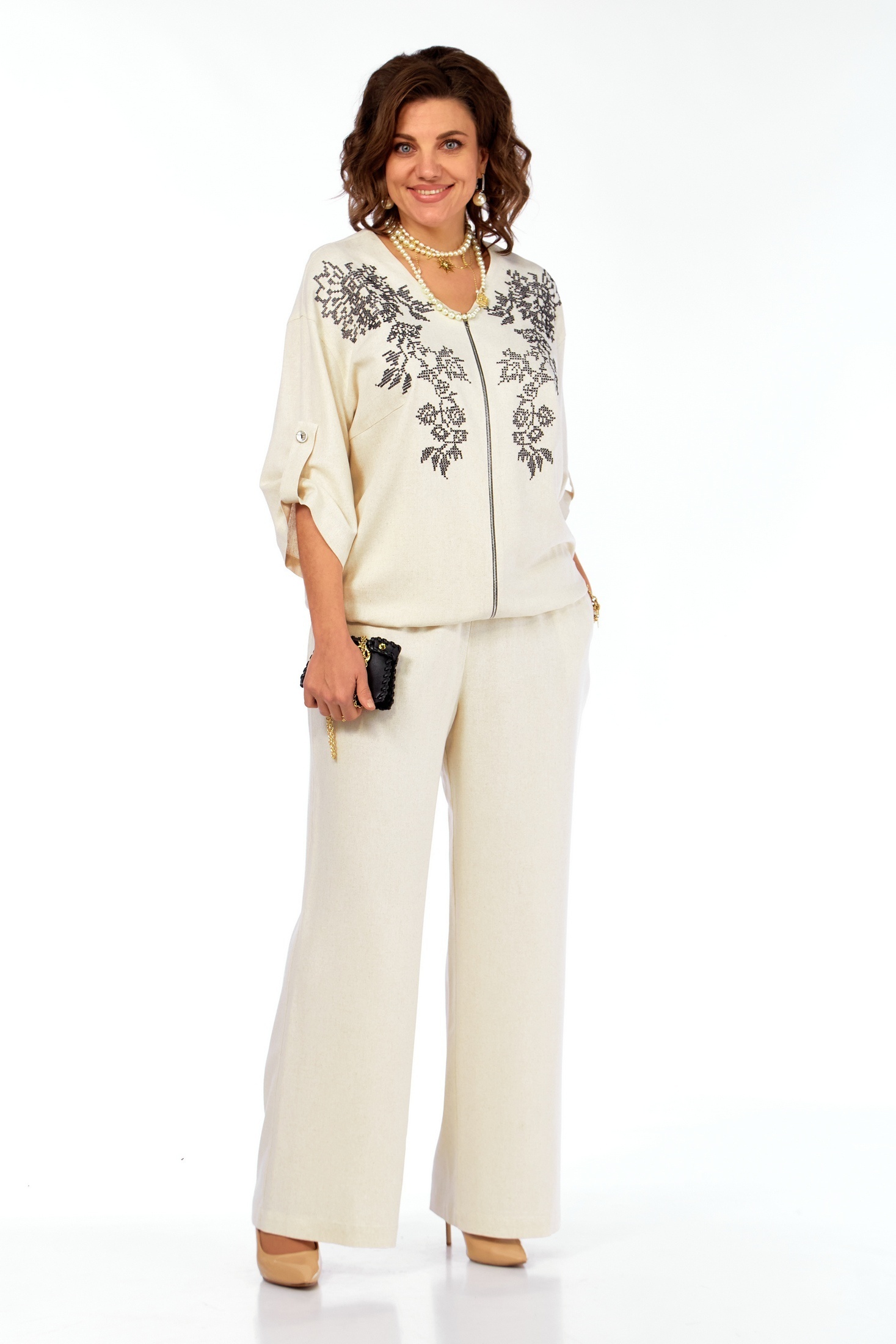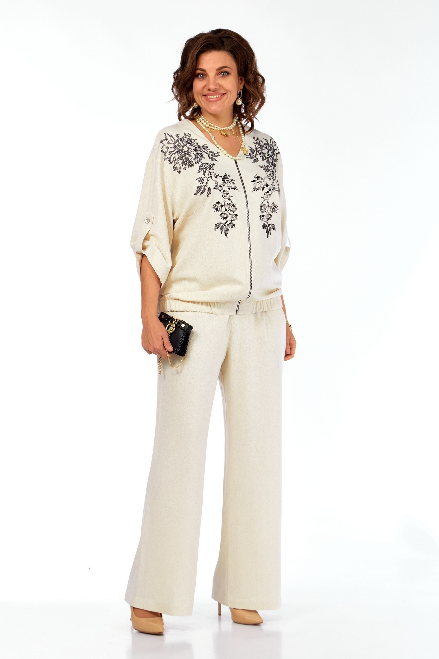 Костюм брючный 281 бежевый Grace for you — это великолепный выбор для летних дней. Коллекция бренда Grace for you предлагает лёгкий и женственный ансамбль из льна, который обеспечивает комфорт и стиль. Благородная льняная ткань с добавлением вискозы позволяет коже дышать, создавая ощущение лёгкости и прохлады. Прямой силуэт жакета с дизайнерской вышивкой и молнией на передней части создает современный и удобный образ. Джакет дополнен рукавами ¾ с патами на пуговицы, снабжён широкими складками на кокетке и резинкой внизу, что добавляет оригинальности. Широкие брюки с наклонными карманами и резинкой на поясе обеспечивают свободные движения, идеально подходящие для прогулок и встреч с друзьями. Бежевый цвет добавляет образу изысканности, делая костюм универсальным в использовании.