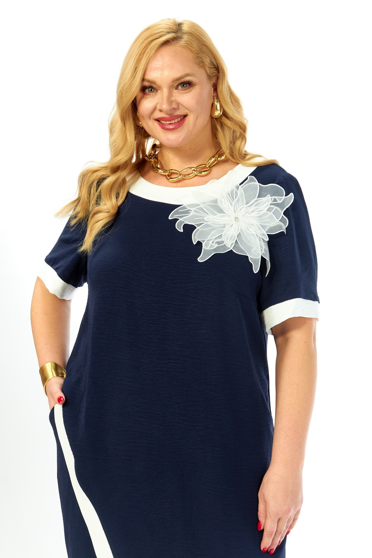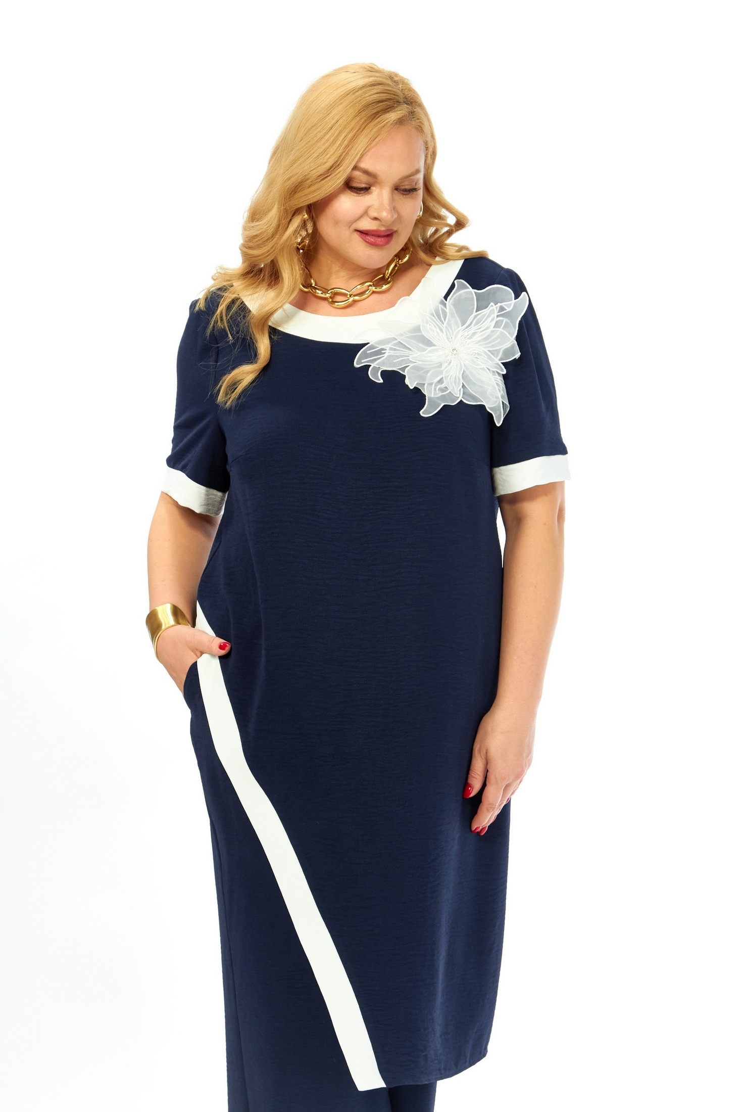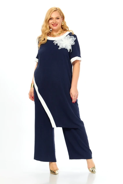 Костюм брючный 289 Grace for you от бренда Grace представляет изысканный выбор для стильных женщин. Коллекция бренда Grace сочетает в себе современные тенденции и комфорт. Легкий и нарядный костюм состоит из асимметричной туники и прямых брюк. Туника имеет свободный силуэт с нагрудными вытачками и потайной молнией на спинке, декорирована изящным цветком. Короткие втачные рукава приспособлены для теплой весны и лета. Брюки с резинкой на поясе подчеркивают комфорт при носке, а наклонные карманы добавляют функциональности. Выполненный в синем цвете из приятной к телу вискозы с добавлением полиэстера и лайкры, костюм подходит для повседневного ношения и прогулок.