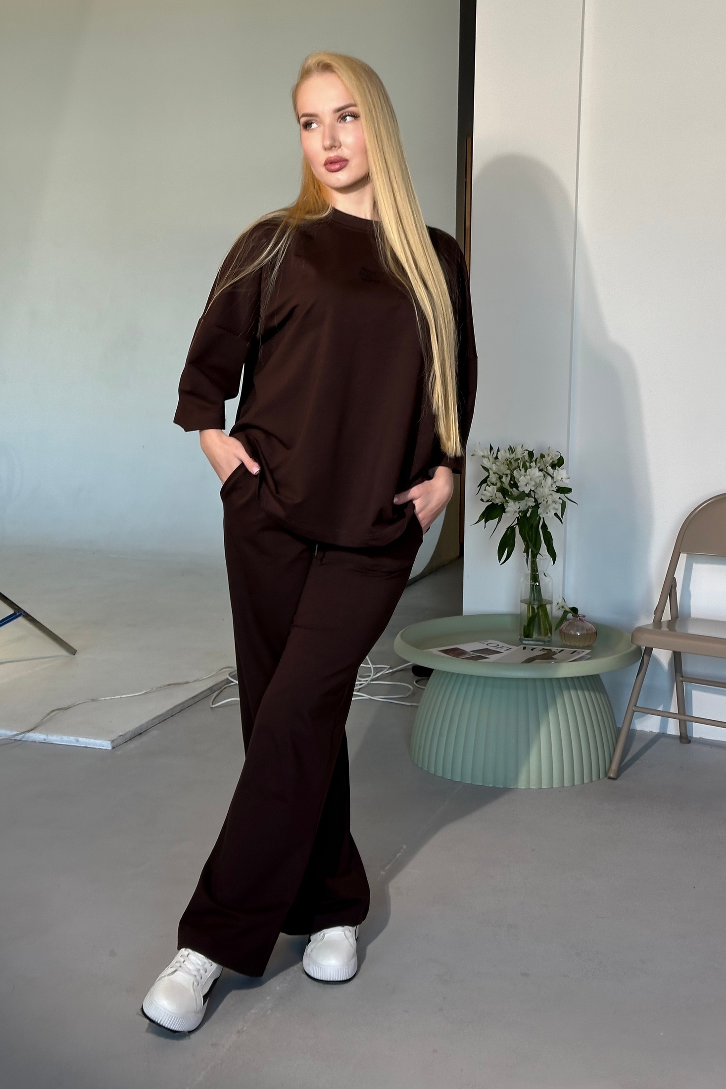 Костюм брючный 25ICY095 шоколад ICY Street — идеальный выбор для повседневных и городских образов. Коллекция бренда ICY Street выполнена из мягкого трикотажа 2х нитка, который состоит из 95% хлопка и 5% лайкры. Это обеспечивает комфорт и отличную посадку благодаря эластичности материала. Свободный крой майки oversize со спущенной линией плеча и углублённой проймой включает круглый вырез с притачной обтачкой. Изюминку образу добавляет декоративная надпись по центру переда. Брюки-палаццо с чистой линией кроя и удобными боковыми карманами заключены в притачной пояс на резинке. Шоколадный цвет костюма подчёркивает стиль и актуальность в любой ситуации, делая его незаменимым в весенне-летнем гардеробе.
