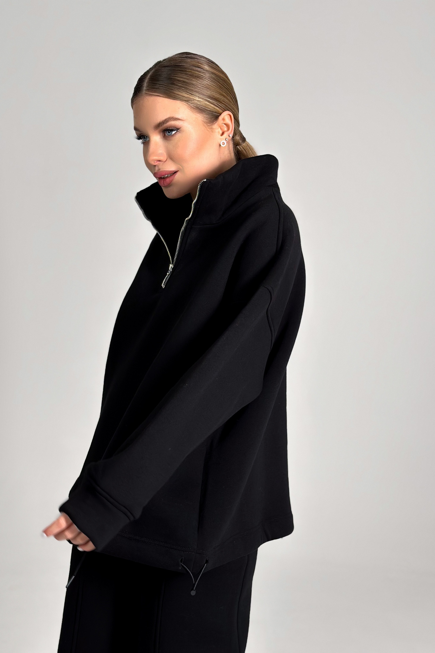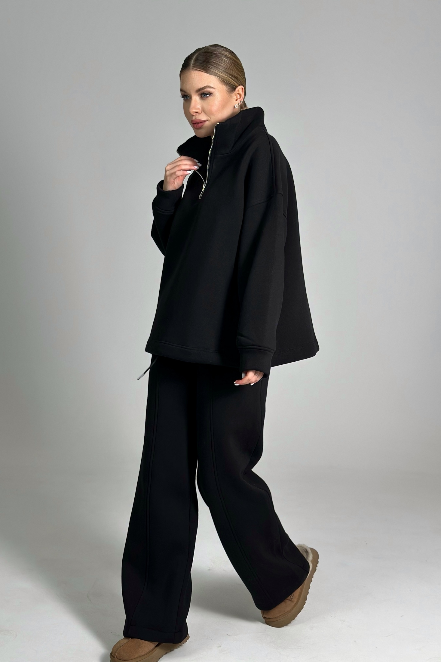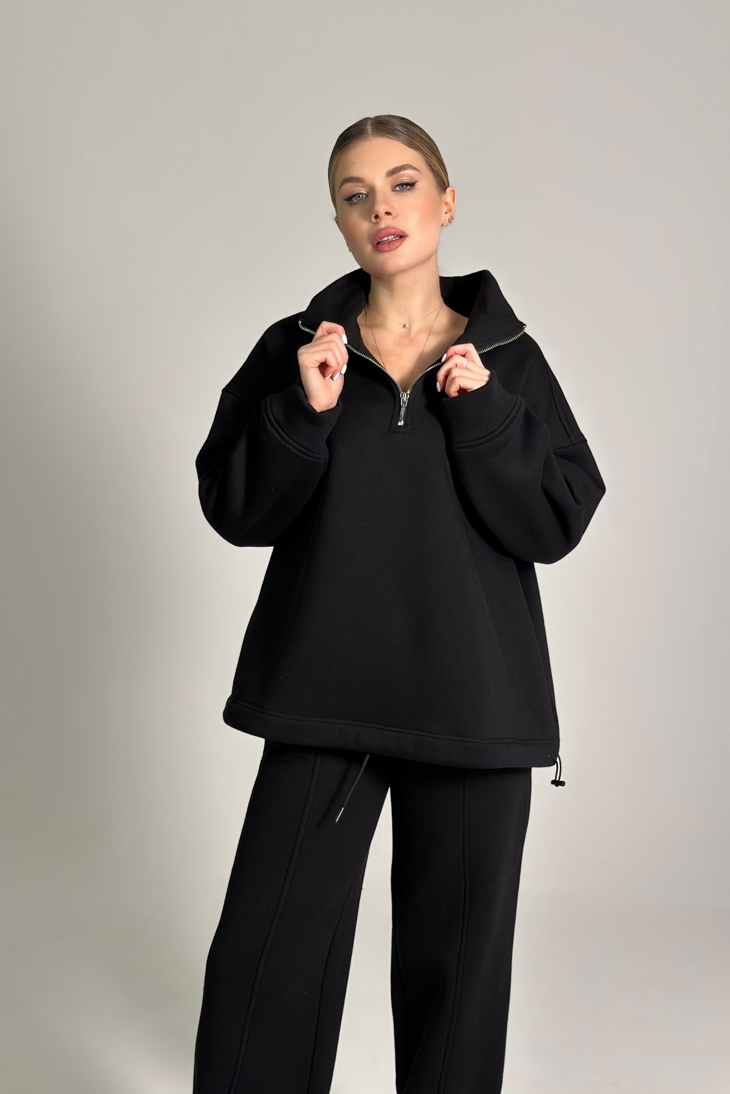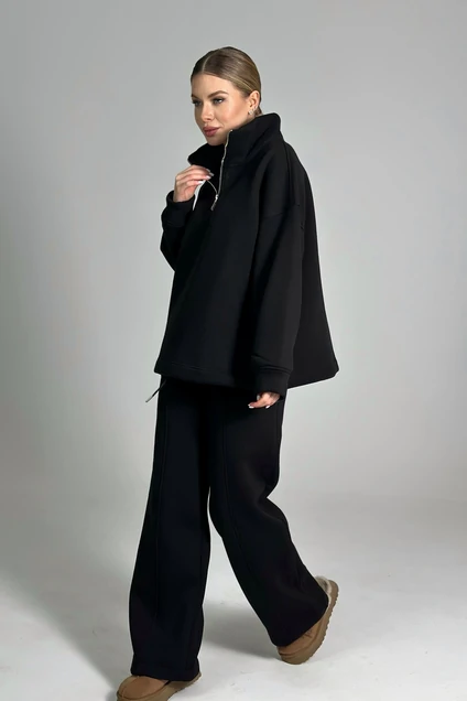Костюм брючный 25ICY103Ч-4 черный ICY Street представляет собой стильное решение для осенне-зимнего гардероба. Коллекция бренда ICY Street предлагает удобный костюм из мягкого трикотажа с начёсом, обеспечивая комфорт и тепло в повседневной жизни. Джемпер оверсайз-кроя с воротником-стойкой и молнией длиной 25 см, а также регулируемой шириной по низу подходит для создания модного и расслабленного образа. Его дополняют угловые карманы для максимальной практичности. Брюки палаццо прямого кроя с эластичной резинкой позволяют регулировать их длину, а стильный черный цвет делает комплект универсальным. Идеально подходит для прогулок и уютных дней дома.
