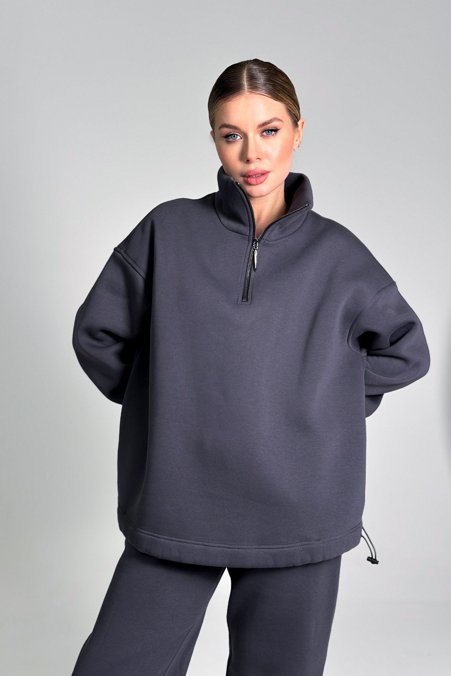 Костюм брючный 25ICY103Г-4 графит ICY Street. Коллекция бренда ICY Street предлагает стильный брючный костюм из мягкого трикотажа с начёсом, который идеально подходит для повседневного комфорта. Джемпер оверсайз-кроя со спущенной линией плеч и объёмными рукавами на резинке создаёт расслабленный образ. Воротник-стойка с молнией длиной 25 см добавляет функциональности, а регулируемая эластичным жгутом ширина подчёркивает удобство. Практичные карманы в боковых швах джемпера и брюк обеспечивают комфорт. Брюки палаццо прямого кроя с шириной по низу 30–31 см дополнены регулируемой резинкой. Графитовый цвет и универсальный стиль делают костюм подходящим для прохладного сезона и повседневных выходов.