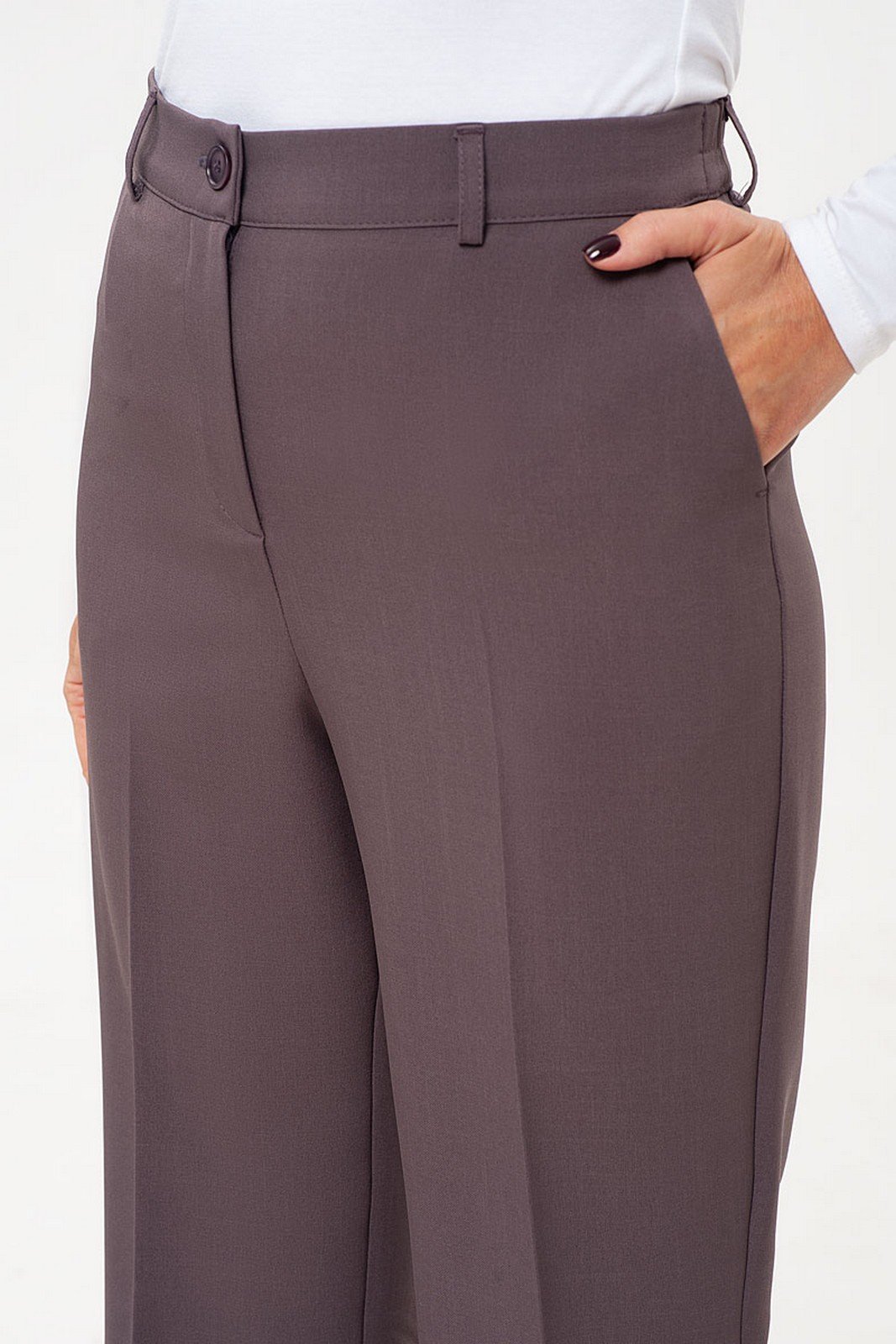 Прямые брюки со стрелками. Высокая посадка на талии. Притачной пояс со шлевками, по спинке сосборен на резинку для комфортной посадки. Застежка на молнию и пуговицу. Спереди косые боковые карманы, по спинке имитация горизонтальных карманов с листочкой.