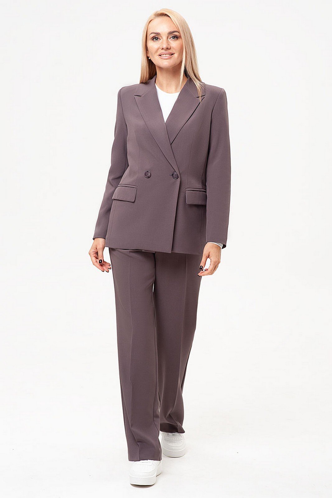 Брючный костюм-двойка. Двубортный жакет полуприталенного силуэта с застежкой на пуговицы. Отложной воротник с лацканами. Перед и спинка с талиевыми рельефами. Спереди горизонтальные карманы с клапанами, в рамку. Спинка со средним швом. Рукава двухшовные. Жакет на подкладке.
