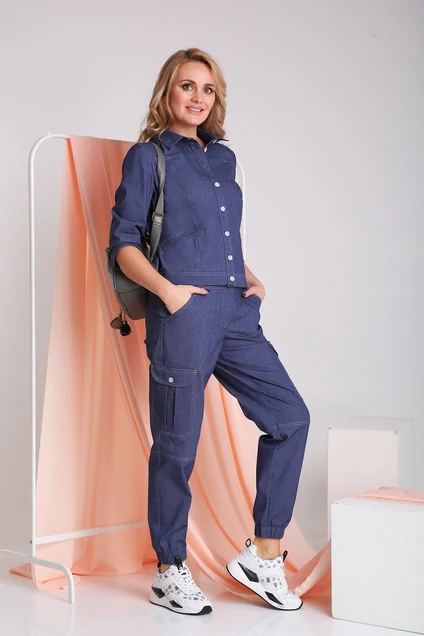 Стильный и современный женский комплект выполненный в спортивно-повседневном стиле из джинса, облегченная куртка-жакет без подкладки и брюки модели типа «карго».
