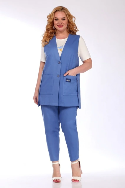Комплект брючный 3-х предметный изготовлен из натуральной льняной ткани, состоит из жилета, брюк и джемпера. Жилет полуприлегающего силуэта с центральной линией борта и застежкой на петли и пуговицы. Горловина V-образной формы. На переде имеются декоративные отлетные шлицы с пуговицами и накладные карманами. Спинка со средним швом и кокеткой. Жилет с ассиметричным низом. Джемпер изготовлен из вискозного полотна, прямого силуэта. Горловина круглая, рукав втачной короткий. Джемпер дополнен печатью. Брюки средней посадки. Пояс притачной с резинкой. В передних деталях обработаны косые карманы в швах.