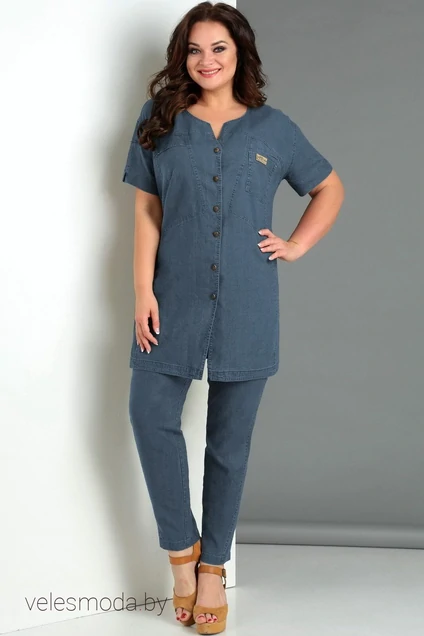 Комплект брючный 2-х предметный из льняной ткани, прошедший заключительную отделку – варка. Рубашка прямого силуэта с фигурным вырезом горловины. Застежка на петли-пуговицы. По переду кокетки, бочки, фигурные вставки. По левой полочке карман с шевроном. Низ закруглен, в боковых швах разрезы. Брюки на поясе с резинкой, с боковыми карманами. По переду вдоль боковых швов подрезы. Длина рубашки по спинке - 80 см, рукава – 17 см. Длина брюк по боковому шву - 96 см. лен – 74% хлопок – 26%