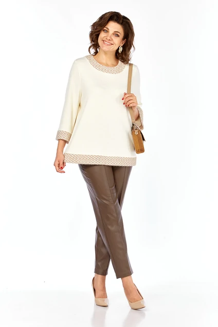 Комплект женский брючный, состоит из джемпера и брюк. Джемпер свободного кроя. По горловине , низу изделия и низу рукавов декоративные вставки из отделочной ткани. На спинке декоративная молния. Брюки женские, зауженные к низу, выполнены из экокожи. На передних деталях брюк застрочены стрелки и обработаны карманы. Пояс притачной, частично на эластичной тесьме.