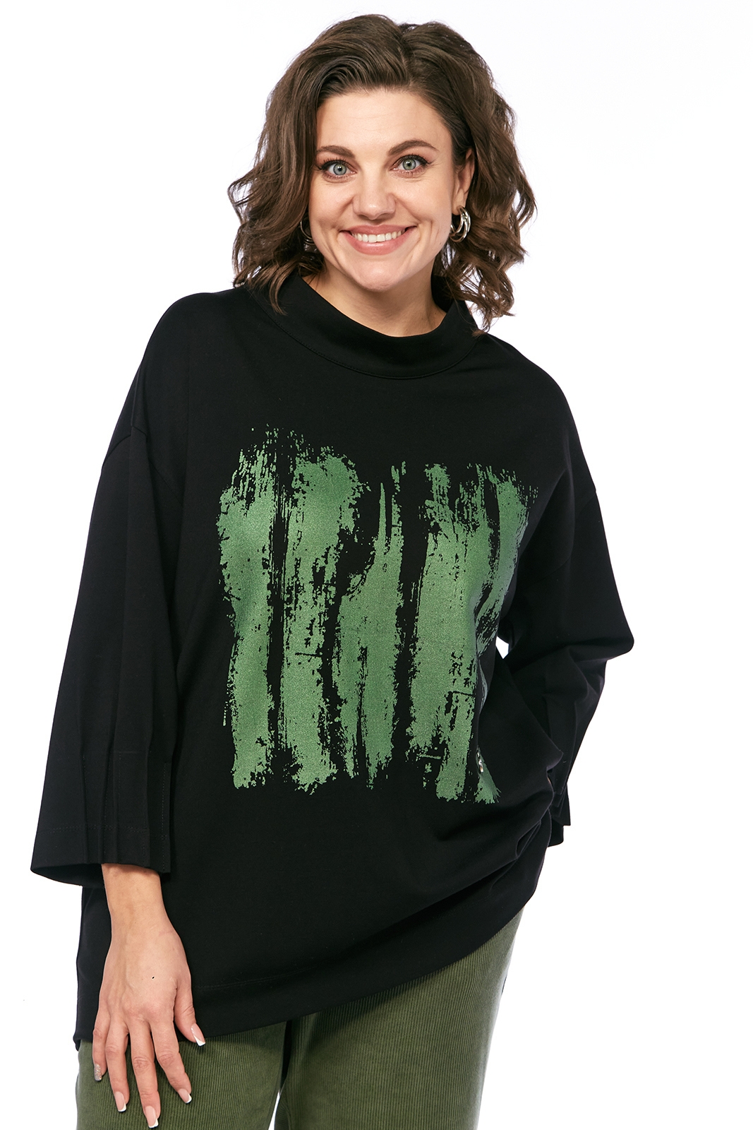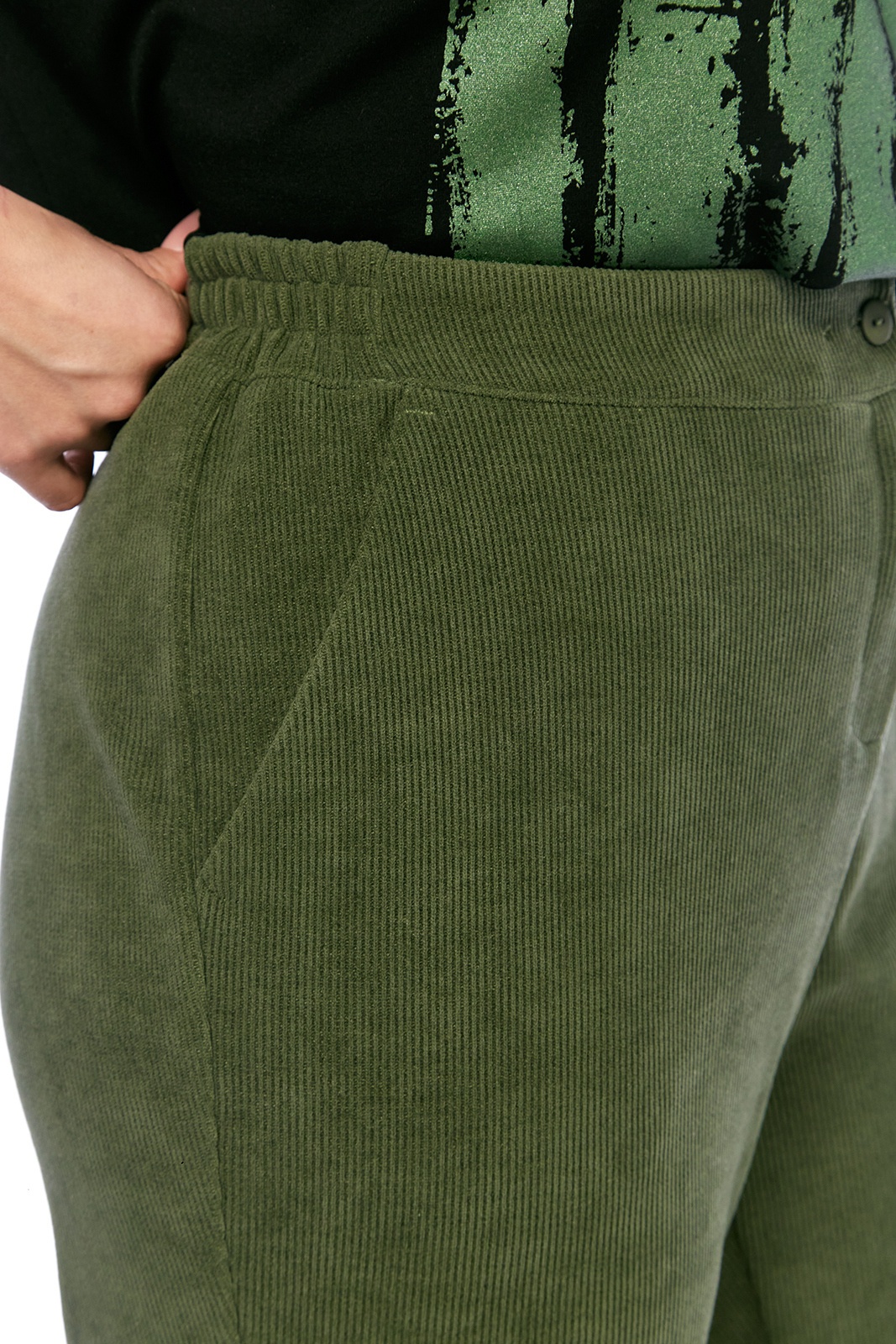 Комплект брючный двухпредметный, состоит из джемпера и брюк. Джемпер свободного силуэта, выполнен из трикотажного полотна. Горловина обработана воротником-стойка. Перед и спинка цельнокроеные. Рукава спущенные с защипами. Джемпер дополнен дизайнерской печатью. Брюки средней посадки, выполнены из вельветовой ткани. Заужены к низу. Пояс притачной со вставками с эластичной тесьмой. Застежка на молнию и петлю с пуговицей. В передних деталях брюк карманы с подрезным бочком.