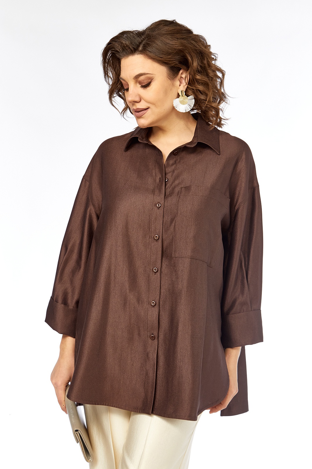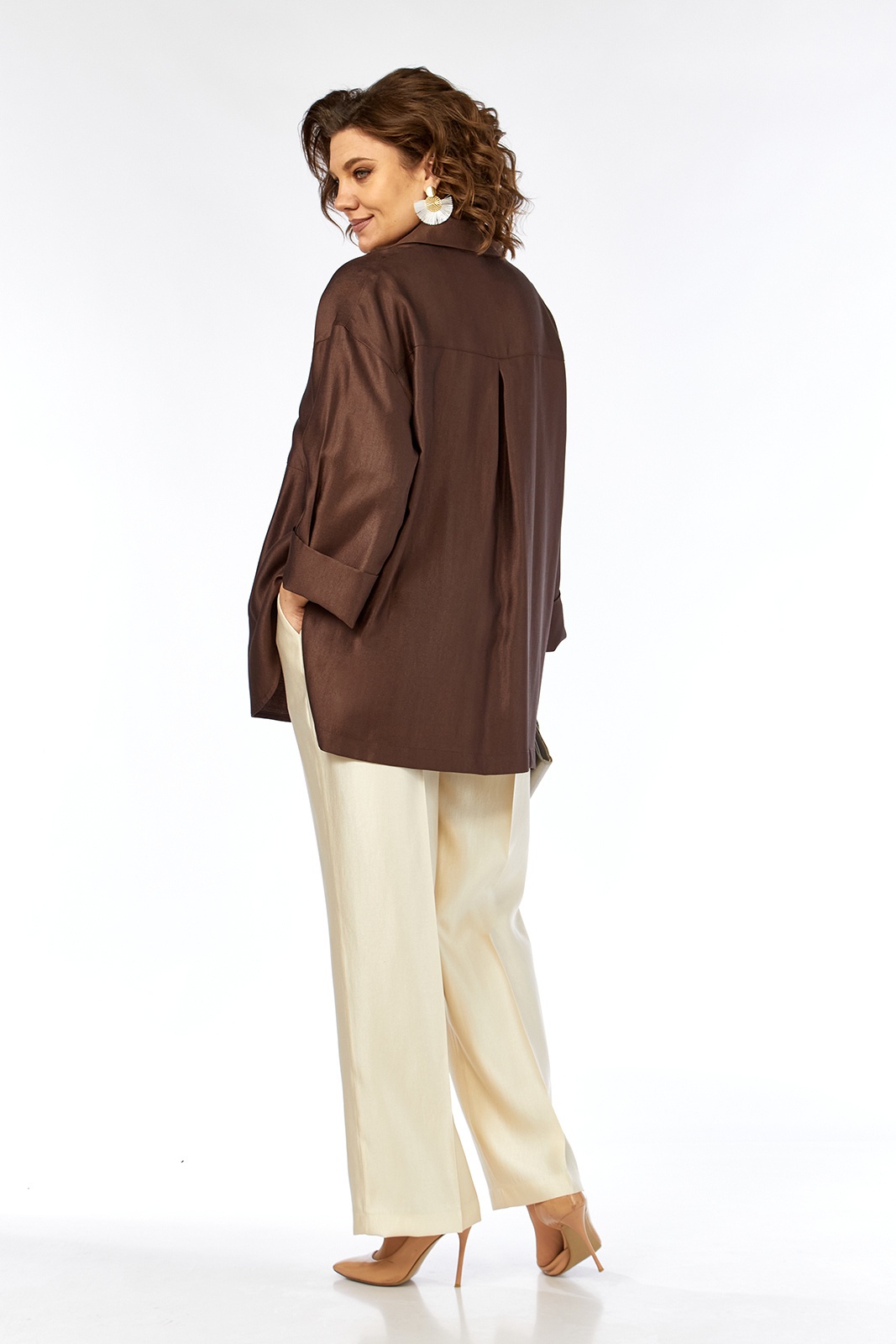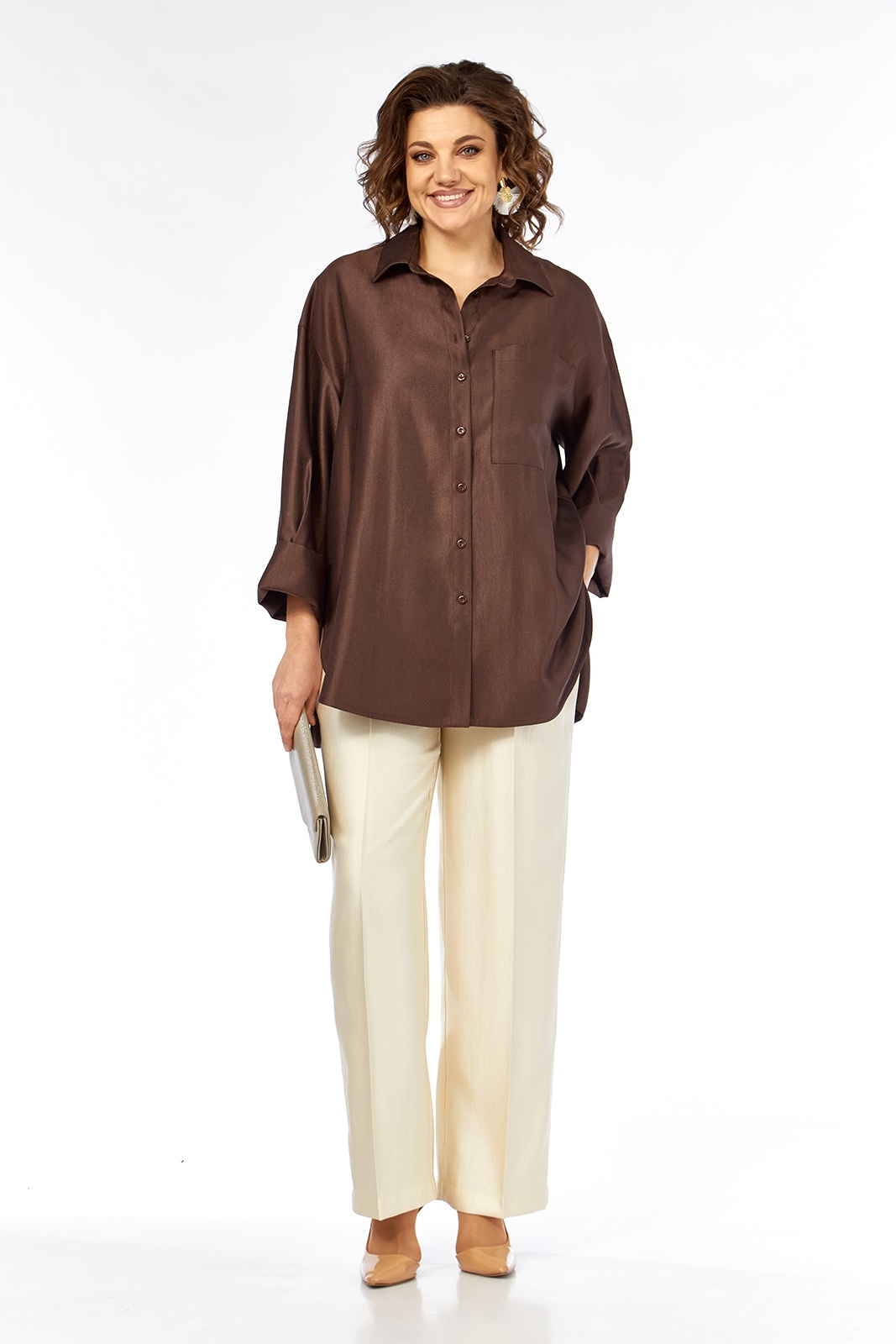 Костюм брючный 3448-3 Jurimex представляет собой стильное решение для повседневной жизни. Коллекция бренда Jurimex выполнена из материала с мерцающим эффектом, состоящего из вискозы, полиэстера и полиамида, что обеспечивает прочность и комфорт. Блуза свободного кроя с рубашечным воротником и центральной застежкой на пуговицы. Особую привлекательность создаёт настрочной карман и притачная кокетка на спинке с встречной складкой. Спущенные рукава с широкой притачной манжетой добавляют образу женственности. Низ блузы оформлен фигурно. Прямые брюки с резинкой на поясе и карманами предлагают удобство и свободу движений. Демократичное сочетание бежевого и шоколадного цвета делает костюм универсальным выбором для весенне-летнего сезона.