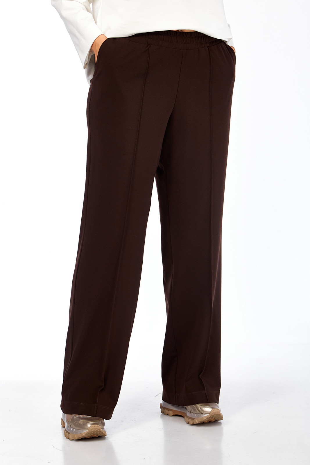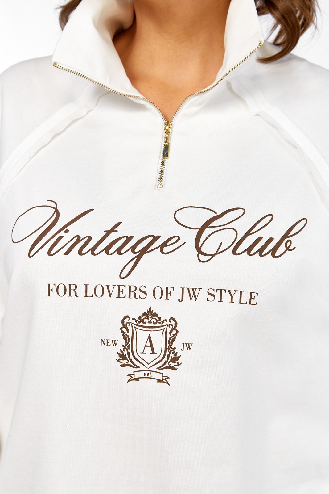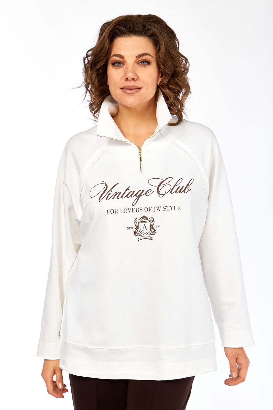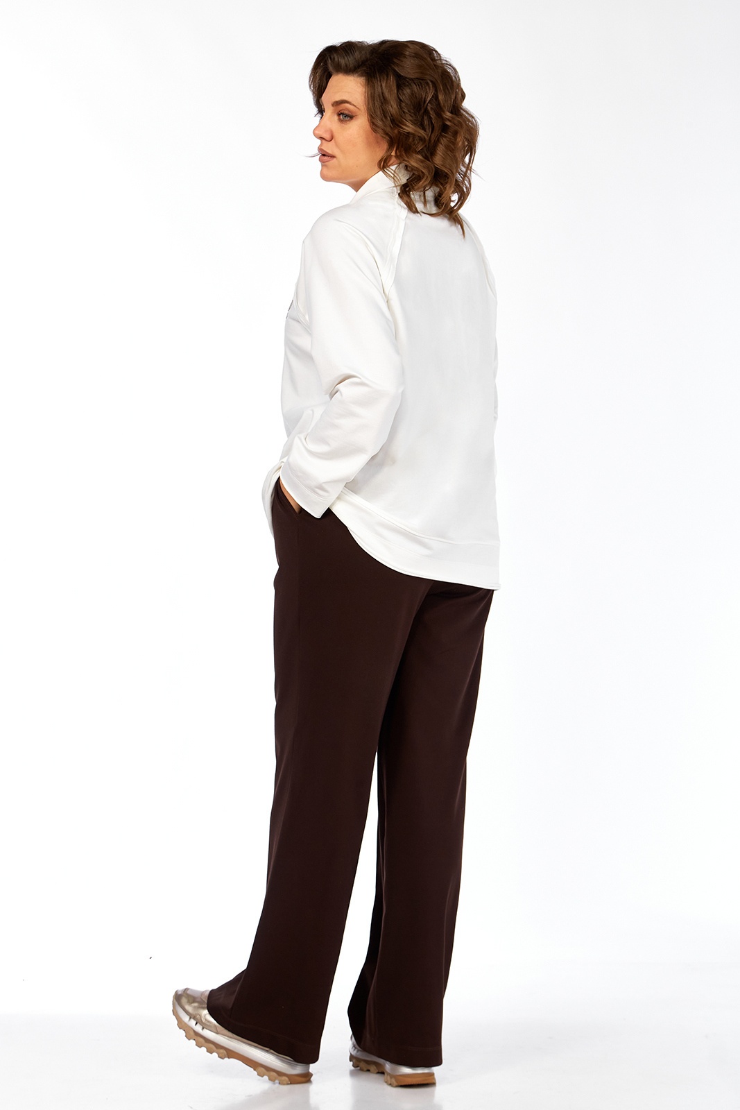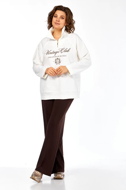 Комплект брючный двухпредметный, состоит из джемпера и брюк. Джемпер свободного силуэта изготовлен из хлопкового полотна, с воротником стойка на молнии. Перед и спинка в области бедер с декоративным подрезом. Рукава — реглан. Низ изделия,низ рукавов и швы втачивания рукавов выполнены необработанным срезом. Джемпер дополнен дизайнерской печатью. Брюки прямого силуэта с притачным поясом на эластичной тесьме. В передних деталях брюк обработаны боковые карманы и застрочены канты. Длина джемпера по спинке -68 см, длина плеча — 71 см.
