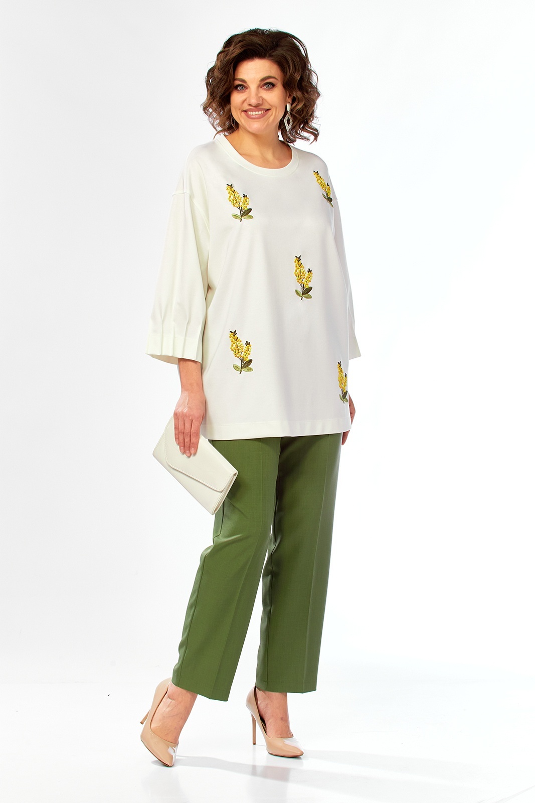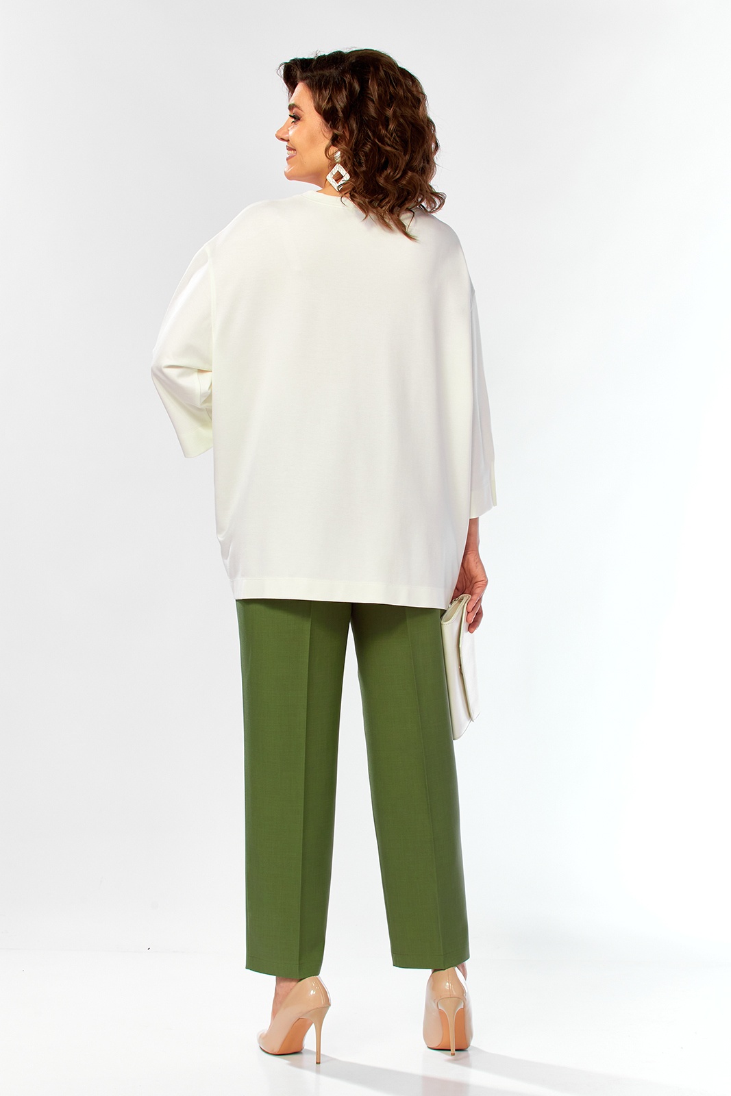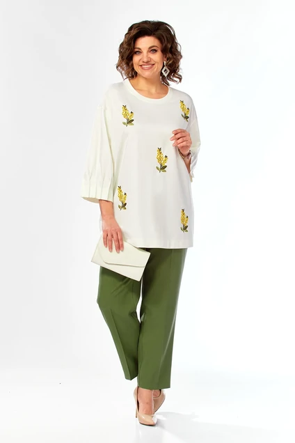 Костюм брючный 3489 Jurimex сочетает в себе стиль и комфорт. Коллекция бренда Jurimex предлагает двухпредметный комплект, включающий джемпер из трикотажного полотна и классические брюки. Джемпер свободного силуэта, дополненный дизайнерской вышивкой, подходит для повседневных и офисных образов. Спущенные рукава и защипы по низу добавляют изящества, а притачной пояс брюк с эластичной тесьмой обеспечивает удобство при носке. Брюки выполнены из качественной костюмной ткани с застёжкой на петлю и пуговицу. Цветовая гамма костюма включает белый джемпер и брюки насыщенного зелёного оттенка, идеально подходят для весенне-летнего сезона. Длина джемпера по спинке составляет 71 см, а длина брюк по боковому шву — 103 см.