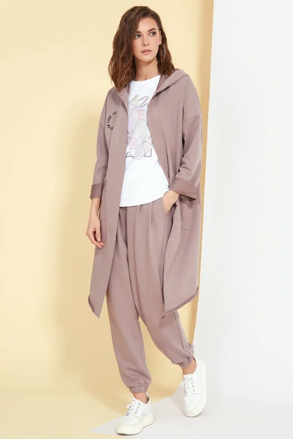 Комплект: кардиган + брюки. Кардиган свободного кроя с ассиметричным низом, капюшоном и накладными карманами, без застежки и без подкладки. линия плеча спущена. По передней полочке и спинке декорирован авторским принтом. Рукав длинный. Брюки свободного силуэта, по поясу и низу на резинке. По переду карманы с наклонным входом. Длина кардигана по переду /по спинке 95 см./ 83 см. Длина рукава/ Длина брюк 46 см /104 см.