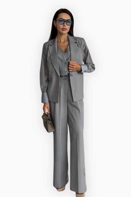 Костюм женский, состоящий из жакета-блузы и брюк. Жакет выполнен из двух видов ткани, перед двухслойный. Верх отлетной, выполнен из костюмной ткани с подкладкой. Перед жакета – с центральной бортовой застежкой на петлю и пуговицу, слева карман с листочкой (нефункциональный), вертикальные вытачки. Горловина обработана воротником пиджачного типа. Нижний слой выполнен из блузочной ткани. Перед блузки с центральной застежкой, обработаны вытачки нагрудные и отстрочная планка, которая застегивается на петли и пуговицы. Горловина блузки V – образной формы. Спинка с двойной кокеткой из костюмной ткани, нижняя часть спинки с центральной складкой, выполнена из блузочной ткани. Рукав втачной одношовный из блузочной ткани, по низу обработан широкой притачной манжетой, застегивающейся на петли и пуговицы. Низ фигурный. В боковых швах вставлены шлевки для пояса (поясом комплектуется). Брюки женские прямого силуэта. По переду обработана застежка на молнию. По задним половинкам брюк застрочены вытачки. В боковых швах обработаны боковые карманы. Пояс притачной, по переду с застежкой на пуговицу, по задней части на резинке. Декоративные элементы и фурнитура могут отличаться от заявленных на фото. Цвет материала может отличаться по тону в зависимости от настроек вашего устройства! Длина жакета по спинке 44р. - 77 см, 54р. - 79 см. Длина брюк по боковому шву 110 см.