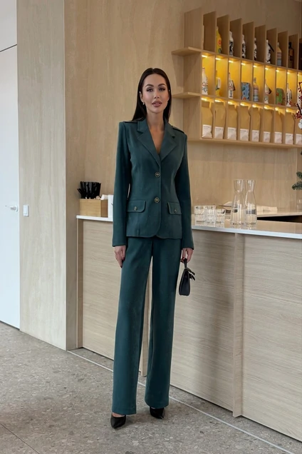 Костюм женский, состоящий из жакета без подкладки и брюк. Жакет женский прилегающего силуэта, с центральной бортовой застежкой на декоративные кнопки. По переду обработаны рельефы, прорезные карманы с листочкой и клапаном, застегивающиеся на декоративные кнопки. Спинка с рельефами и средним швом, в котором обработана шлица. Воротник с отрезной стойкой. Декоративные паты с кнопкой по плечевым швам. Рукав двухшовный, длинный с имитацией шлицы, которая декорирована кнопками. Все отделочные строчки выполнены гарусной нитью контрастного цвета. Брюки женские, прямые. По переду обработана застежка на молнию, обработаны карманы с наклонным входом. На задних половинках брюк застрочены вытачки. Верх обработан притачным поясом (резинка по спинке), застегивающимся на кнопку. Декоративные элементы и фурнитура могут отличаться от заявленных на фото. Цвет материала может отличаться по тону в зависимости от настроек вашего монитора!