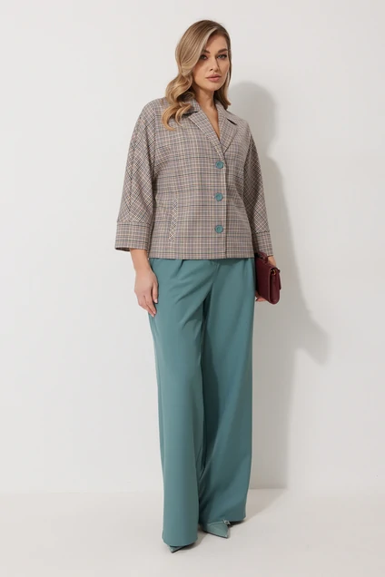 Костюм брючный 2263 Kaloris сочетает в себе стиль и комфорт. Коллекция бренда Kaloris подарит вам уникальное ощущение. Изготовленный из полиэстера, вискозы и спандекса, этот костюм обеспечивает идеальную посадку и устойчивость к сминанию. Жакет без подкладки выполнен в крое "летучая мышь" с центральной застежкой на пуговицы и вертикальными карманами с листочками. V-образная горловина с пиджачным воротником и контрастным кантом придают модели изысканность. Брюки прямого силуэта имеют боковые карманы и застежку на молнию. Широкий пояс с частичной резинкой обеспечивает комфорт и удобство. Идеальный вариант для офиса и встреч, этот костюм подходит для осени и весны, добавит элегантности вашему образу. Длина спинки жакета составляет 60 см, а рукава — 66 см.