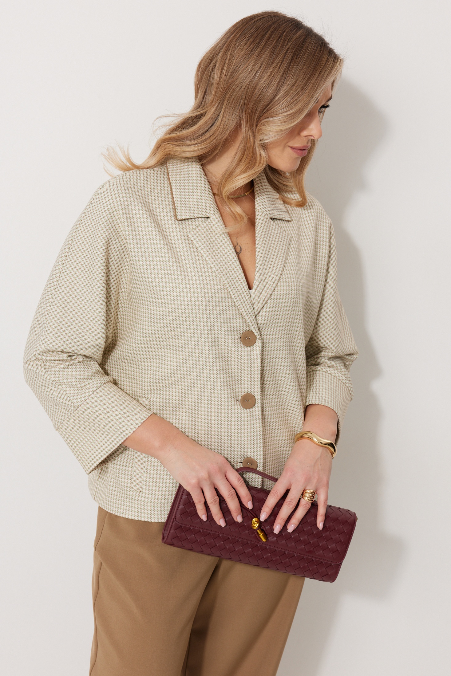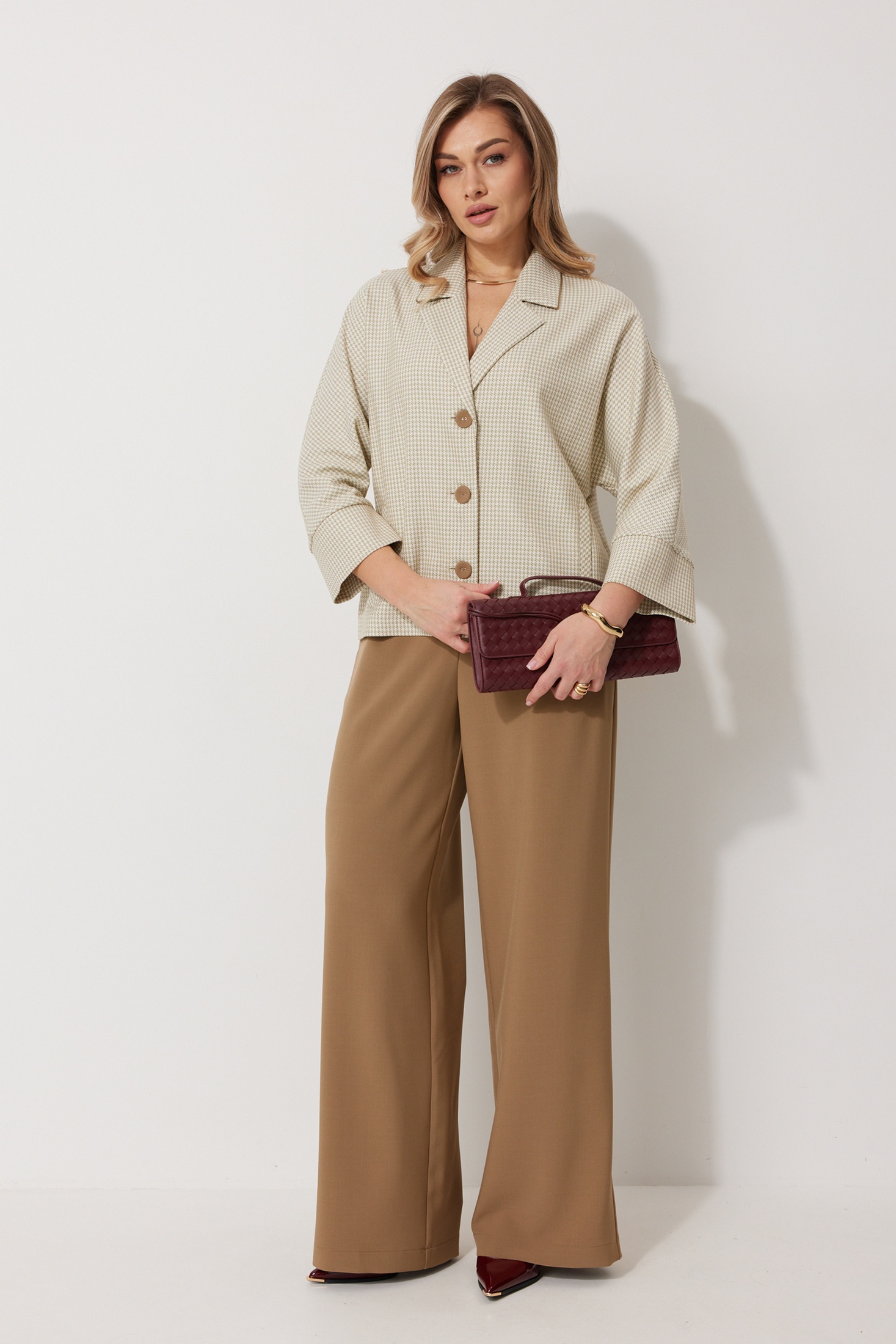 Костюм брючный 2272 Kaloris предлагает уникальное сочетание комфорта и стиля. Коллекция бренда Kaloris представлена жакетом и брюками из полиэстера, вискозы и спандекса, что обеспечивает изделию эластичность и прочность. Жакет кроя 'летучая мышь' без подкладки, с V-образным вырезом и пиджачным воротником с контрастным кантом, дополняется прорезными карманами и манжетами на рукавах 7/8 длины. Брюки прямого силуэта с боковыми карманами и застежкой на молнию обеспечивают практичность и удобство. Данный костюм идеально подходит для делового и повседневного стиля в осенне-зимний сезон. Цветовая палитра включает бежевые тона, что позволяет легко сочетать его с различными аксессуарами. Длина спинки жакета 60 см, длина рукава 66 см.