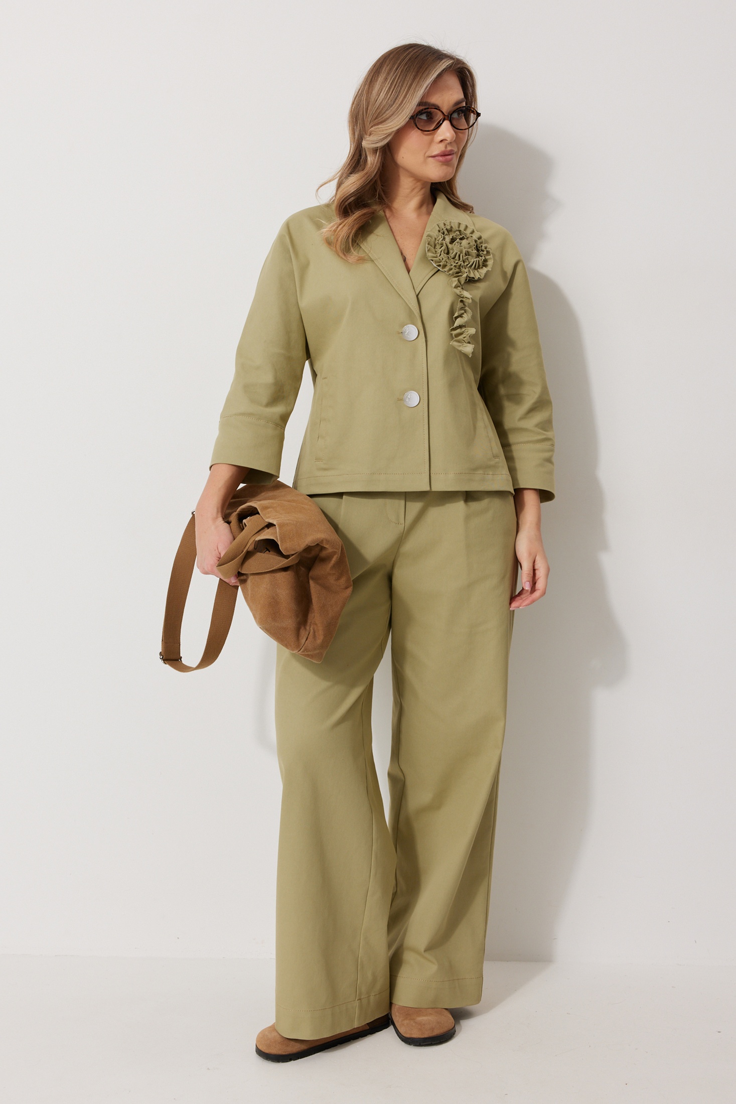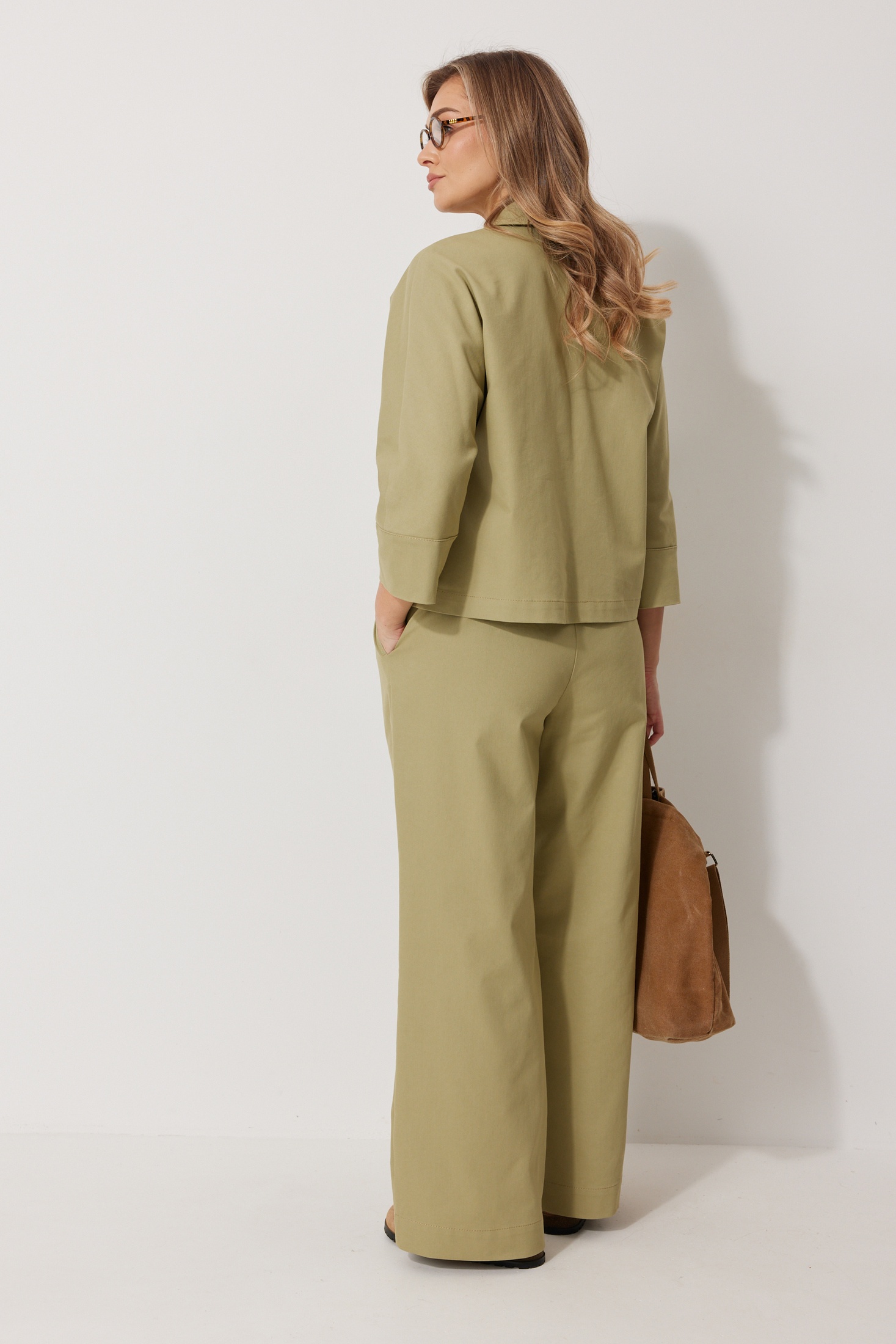 Костюм брючный 2279/1 Kaloris — изысканный комплект для ценителей комфорта и стиля. Коллекция бренда Kaloris предлагает жакет кроя "летучая мышь" без подкладки с авторской брошью и широкими рукавами 7/8 с манжетами. Брюки с высокой посадкой и молнией на передней части подчеркивают утонченность образа. Комплект выполнен из смеси хлопка, полиэстера и эластана, обеспечивая комфорт носки. Естественный бежевый цвет добавляет элегантности. Идеален для офиса, повседневных дел и деловых встреч в любой сезон. Длина спинки жакета — 58 см, длина рукава — 63 см