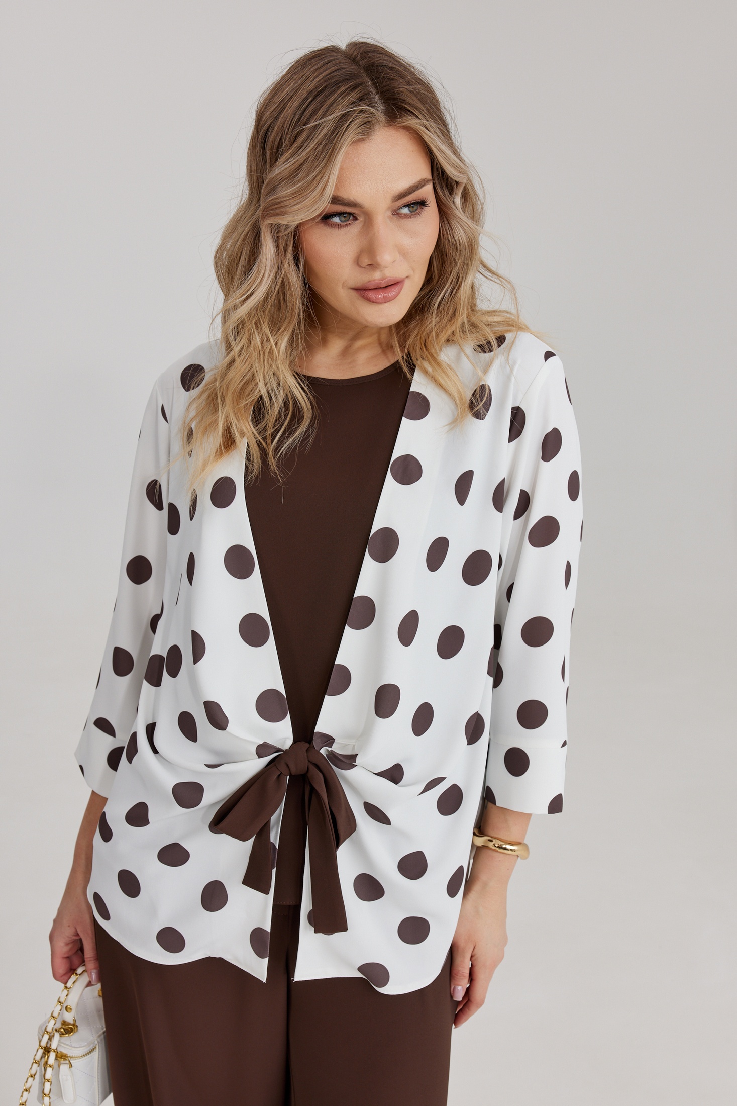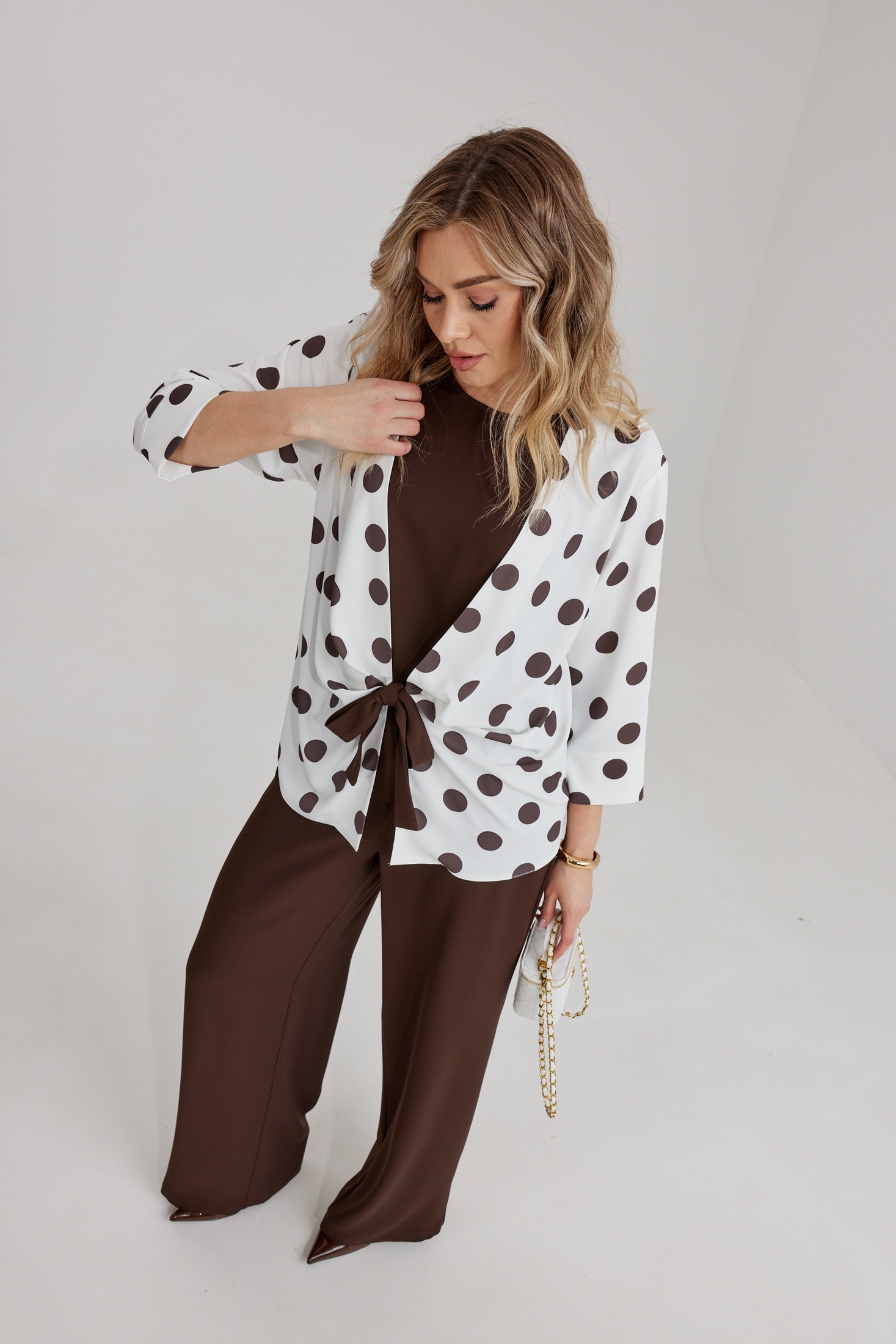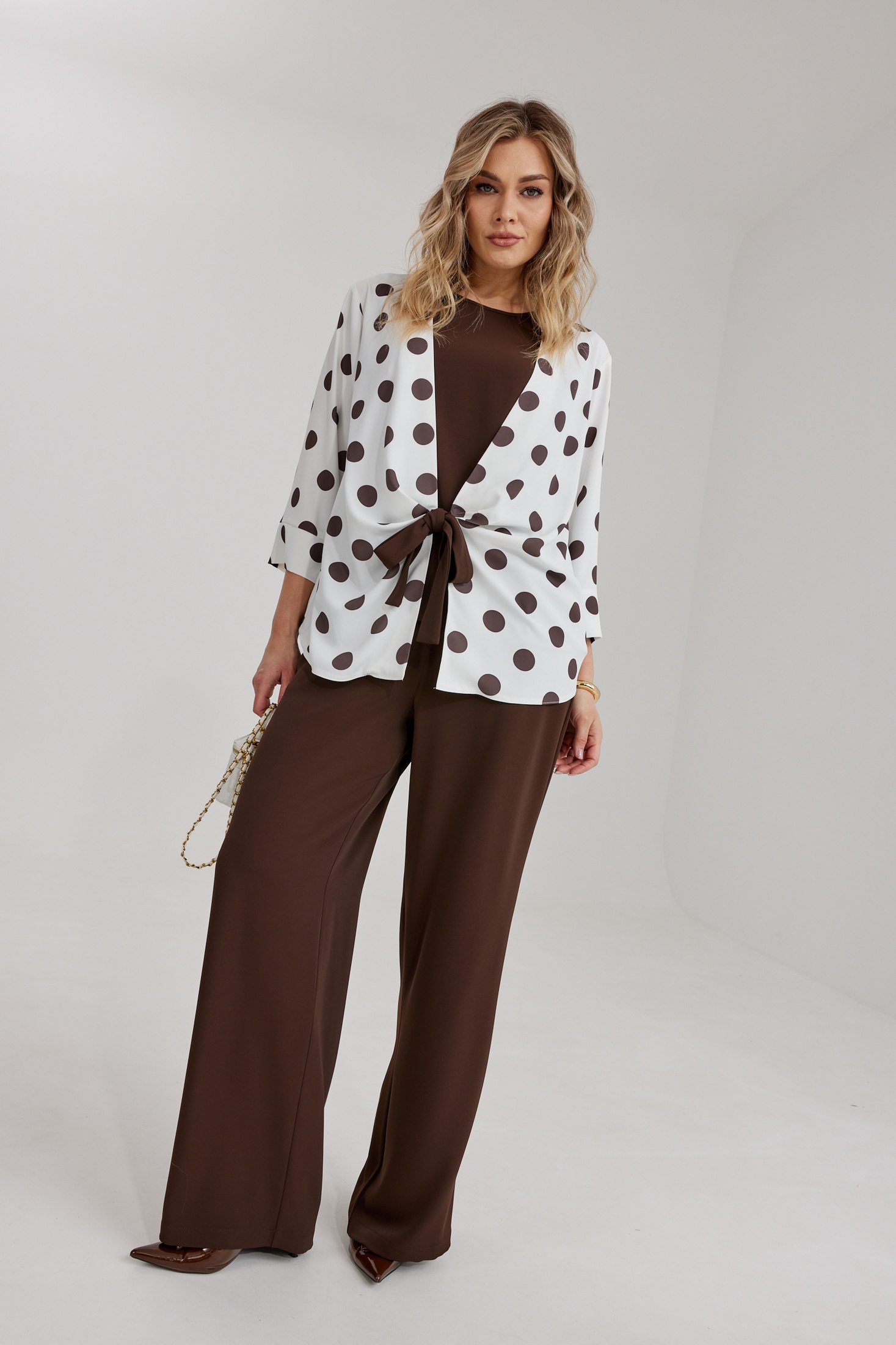 Костюм брючный 2298 Kaloris — это изысканный комплект из плательно-костюмной струящейся ткани, который состоит из брюк, топа и блузона. Коллекция бренда Kaloris предлагает вам насладиться комфортом и стилем. Брюки свободного кроя с широкими штанинами оснащены застёжкой на молнию и пуговицу на поясе, а резинка на задней части обеспечивает удобство. Топ А-силуэта с округлой горловиной гармонично дополнен однотонной тканью. Блузон с контрастным принтом 'горох' и завязками спереди подчеркивает линию талии. Этот костюм из вискозного материала, подходящий для весеннего и летнего сезонов, станет отличным выбором как для повседневной носки, так и для более нарядных событий. Длина спинки изделия составляет 64,5 см, длина рукава — 47,5 см, длина брюк по боковому шву — 109 см, а длина топа — 60 см.
