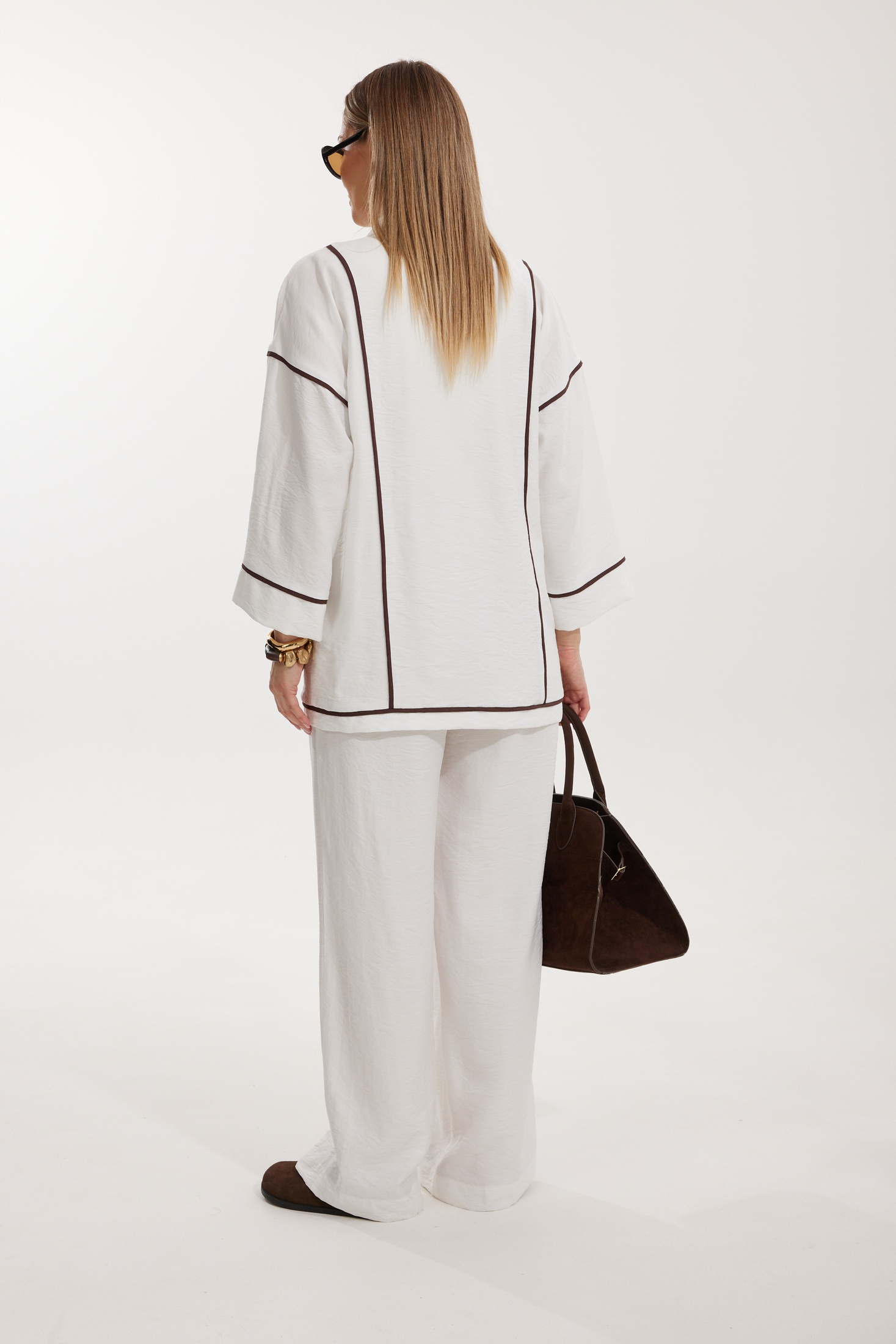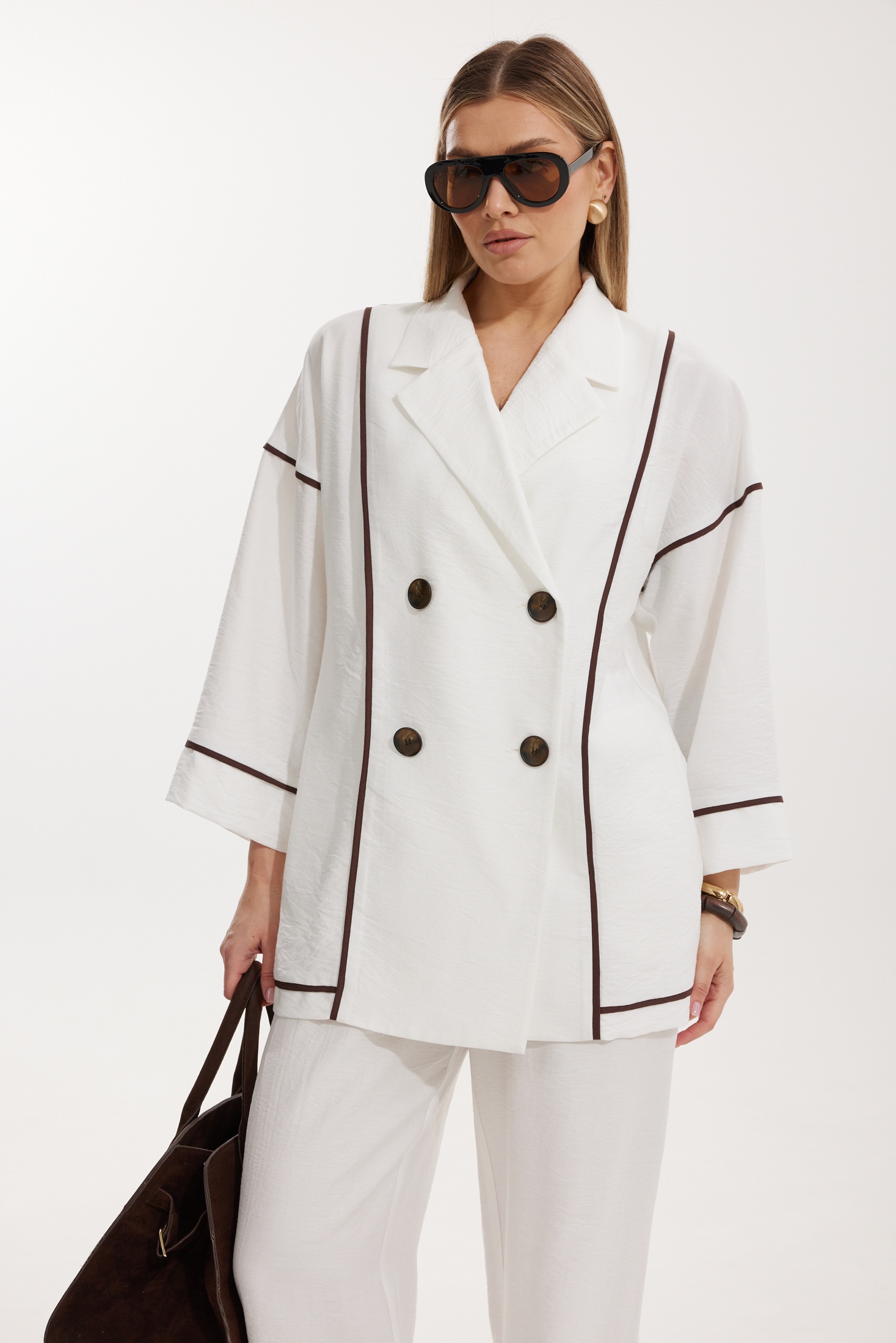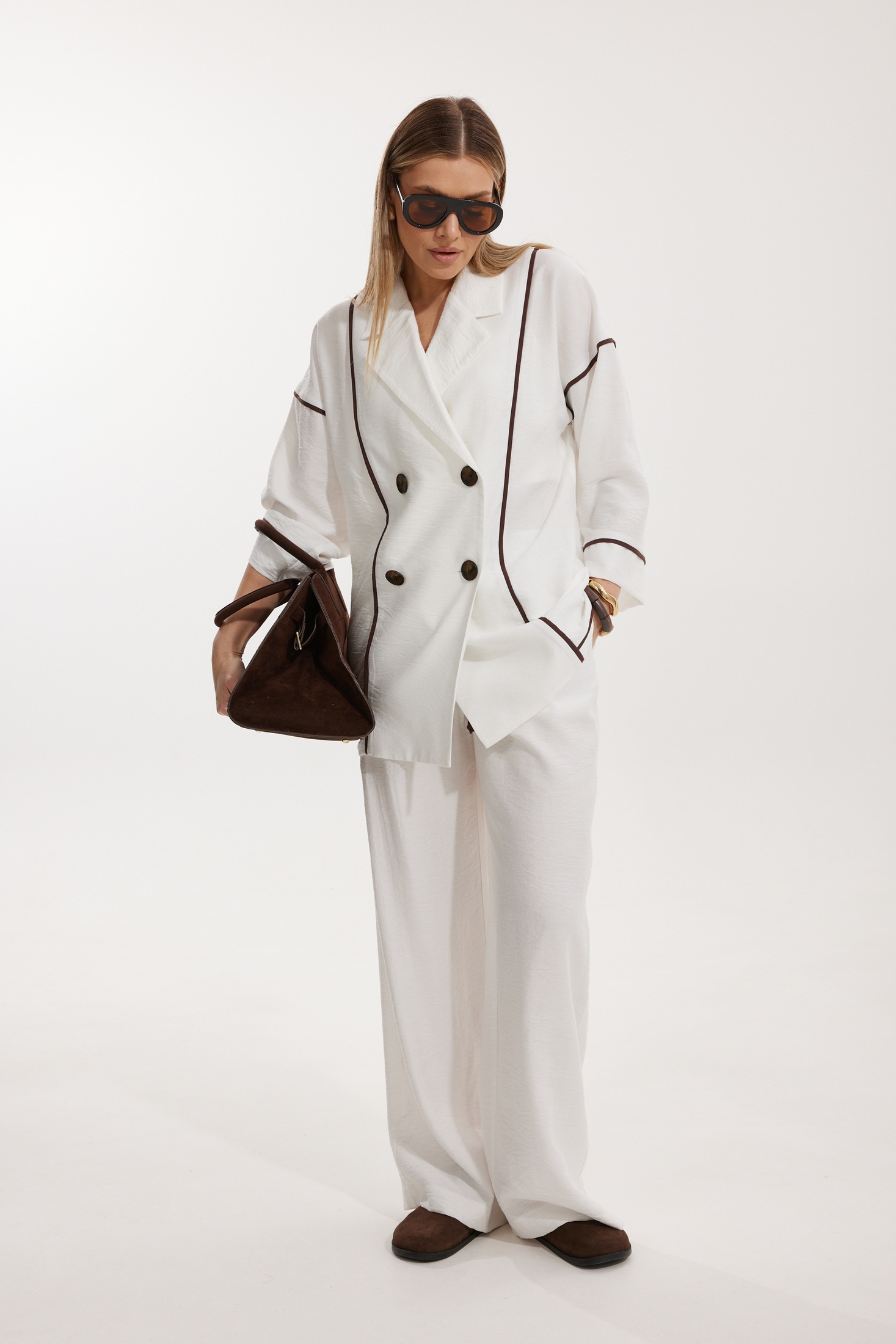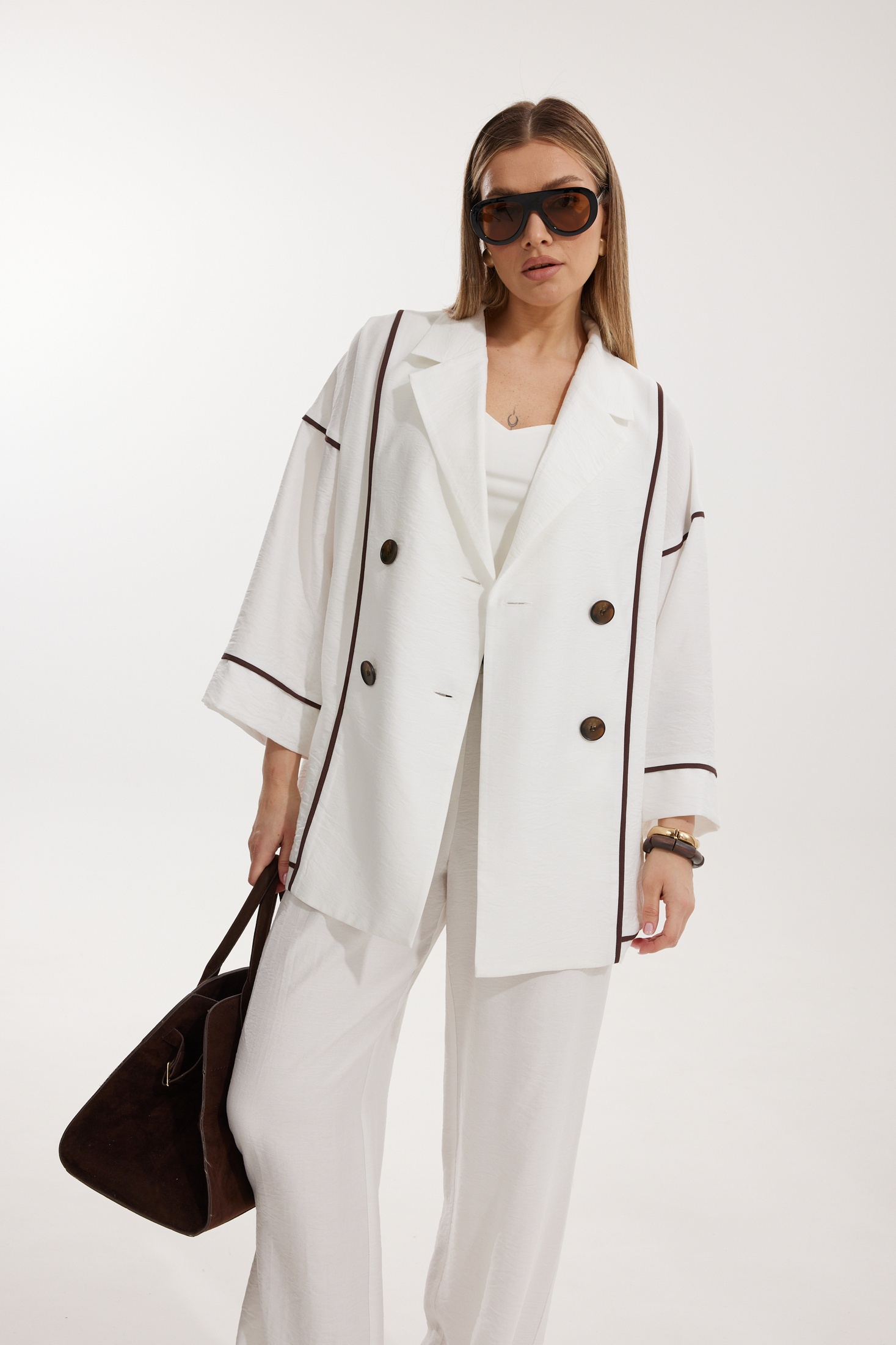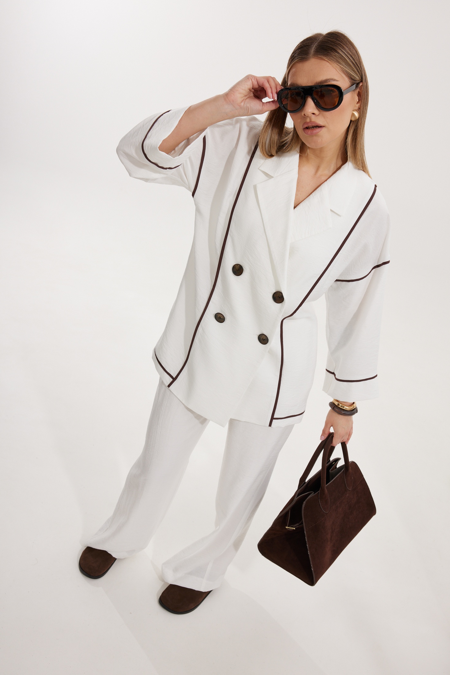 Костюм брючный 2302-1 Kaloris из коллекции бренда Kaloris воплощает стиль и комфорт в одном изделии. Выполненный из сочетания вискозы и нейлона, он дарит мягкость и легкость. Жакет двубортный с контрастными пуговицами и отрезной манжетой добавляет изысканности. Черный кант подчеркивает линии, создавая визуальный интерес. Брюки имеют притачной пояс на резинке со шнуром, обеспечивая комфорт и идеальную посадку. Костюм идеально подходит для офисного гардероба или особых мероприятий в прохладное время. Белый цвет с контрастными акцентами делает его универсальным выбором для любого сезона. Длина спинки изделия составляет 71 см, рукав — 66,5 см, брюки по боковому шву — 110 см.