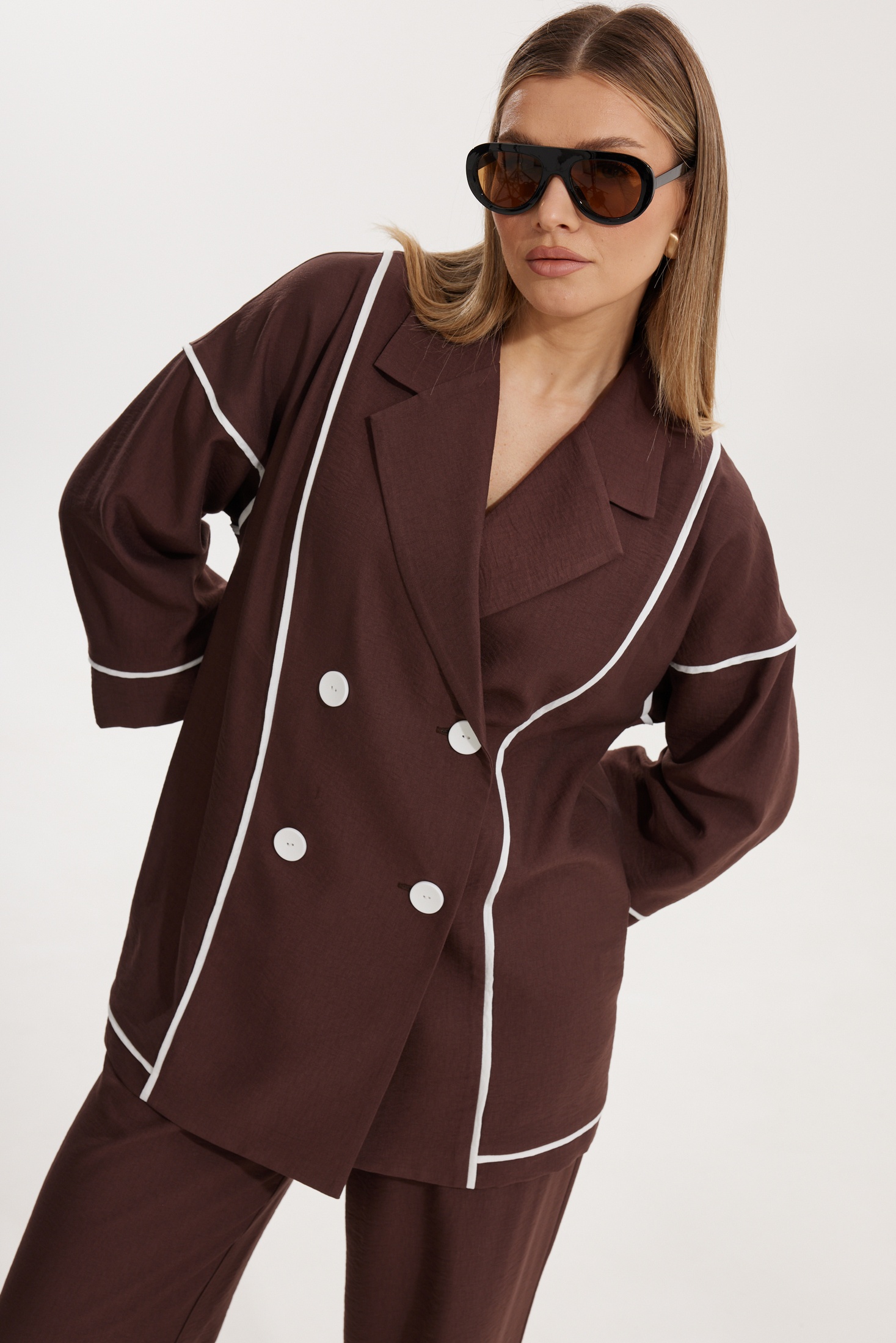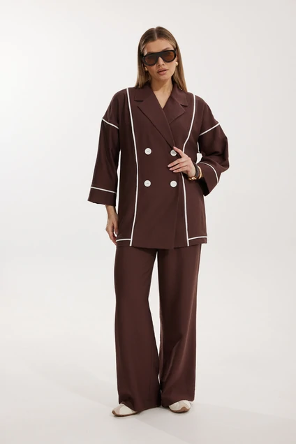 Костюм брючный 2302 Kaloris – идеальный выбор для стильных и комфортных образов. Коллекция бренда Kaloris выполнена из мягкой вискозы, обеспечивая приятные ощущения на коже. Жакет двубортный, прямого силуэта, с контрастным кантом и отрезным воротником. Он дополнен спущенной линией плеча и втачными рукавами с манжетами, длина которых составляет 66,5 см. Брюки прямого кроя с удобными карманами и поясом на резинке, длина по боковому шву 110 см, обеспечивают свободу движений. Общая длина спинки жакета – 71 см. Костюм бордового цвета, идеален для осенне-весеннего периода, подойдёт для офисных встреч и повседневного ношения.