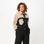 Брюки прямые. Застежка гульфик. Пояс притачной, частично на резинке. По боковым швам настрочена декоративная тесьма в виде 2ух полос контрактного цвета.