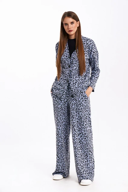 Женский комплект 2-х предметный состоит из кардигана и брюк. Кардиган женский трикотажный свободного объема, прямого силуэта, с V-образным вырезом, длиной до середины линии бедра. Линия плеча спущена. Рукав одношовный, втачной, длинный, низ рукава. Срез борта, горловина спинки и переда обработаны притачными планками. Застежка на три петли и пуговицы.