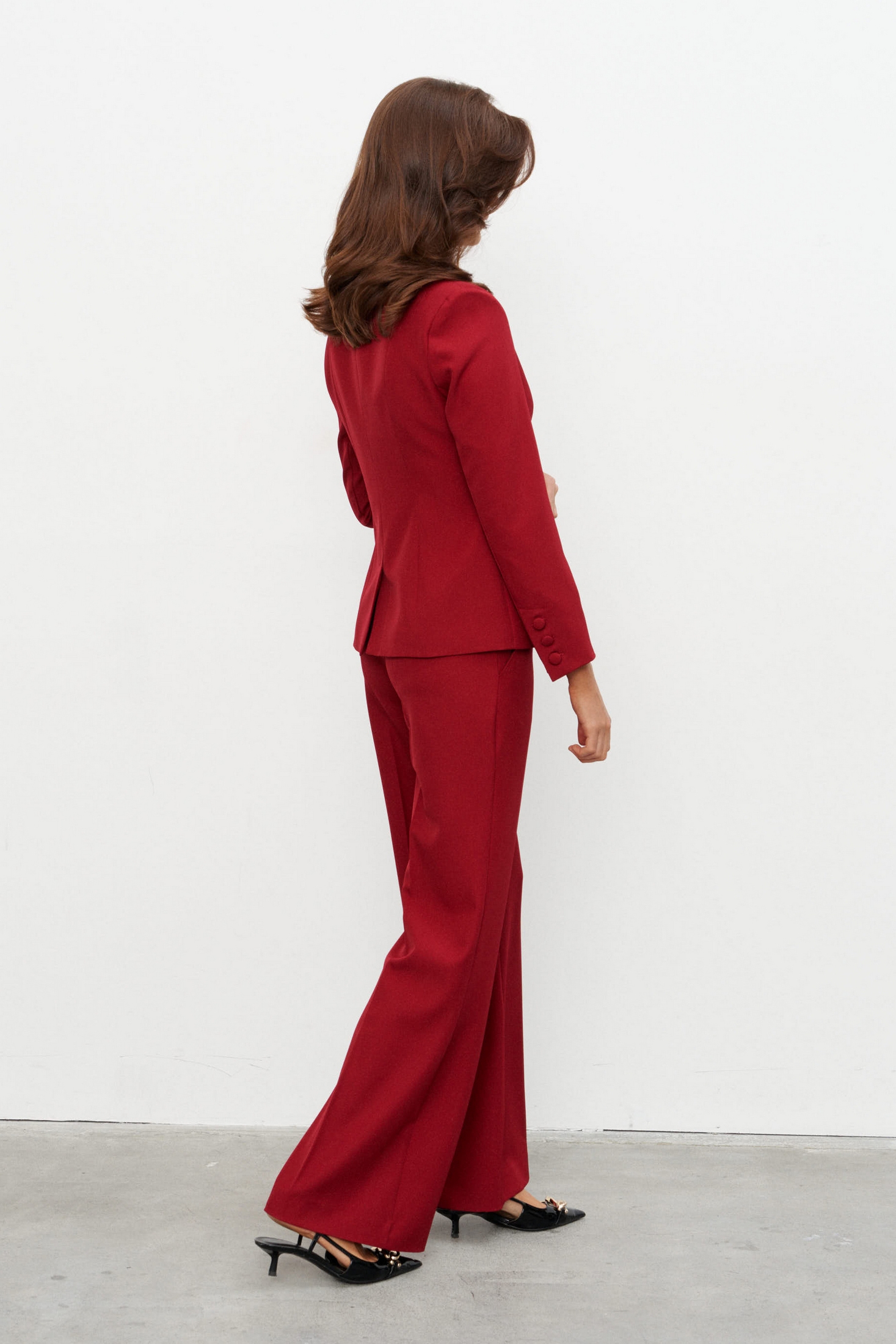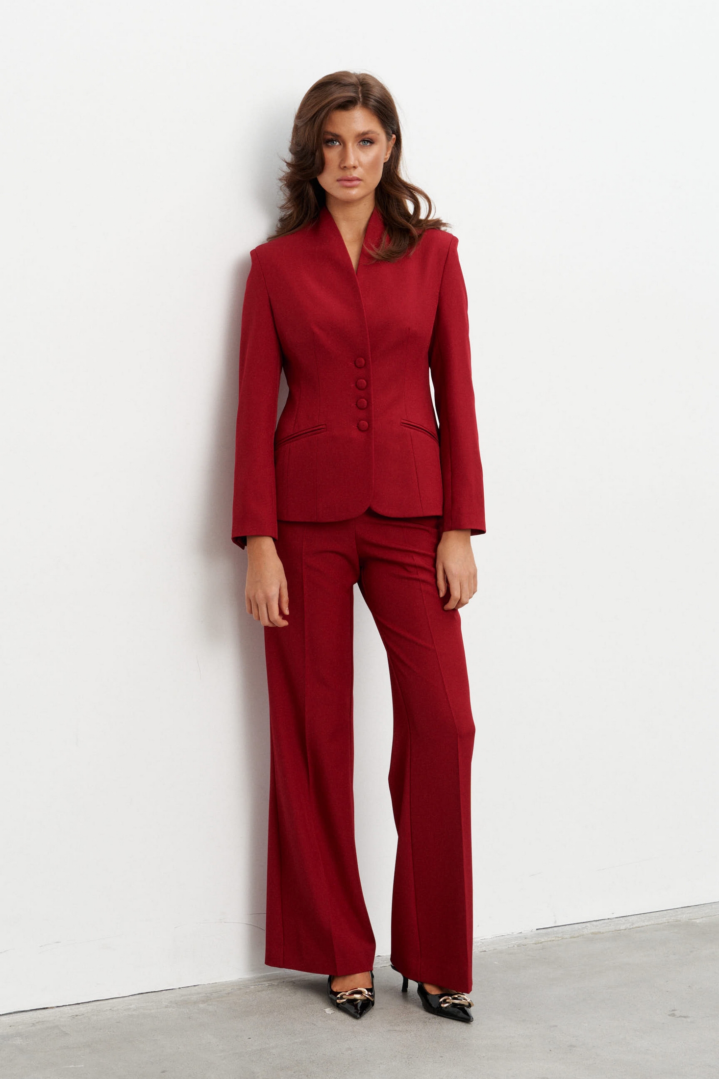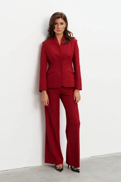 Элегантный женский брючный костюм цвета бургунди — идеальный выбор для деловых и торжественных мероприятий. Костюм состоит из утонченного приталенного жакета и классических брюк. Жакет дополнен оригинальным воротником-стойкой, который плавно переходит в борта, создавая выразительный силуэт. Модель застегивается на ряд элегантных пуговиц, а на передней части расположены прорезные карманы в рамку, добавляющие функциональности. Рукава оформлены шлицами с пуговицами для добавления изысканности. Брюки, выполненные в классическом стиле, имеют карманы по бокам и слегка расклешенный крой, что придает изделию особую изящность и позволяет аккуратно сочетаться с обувью на каблуке. Этот костюм — отличный выбор для создания строгого, но женственного образа.