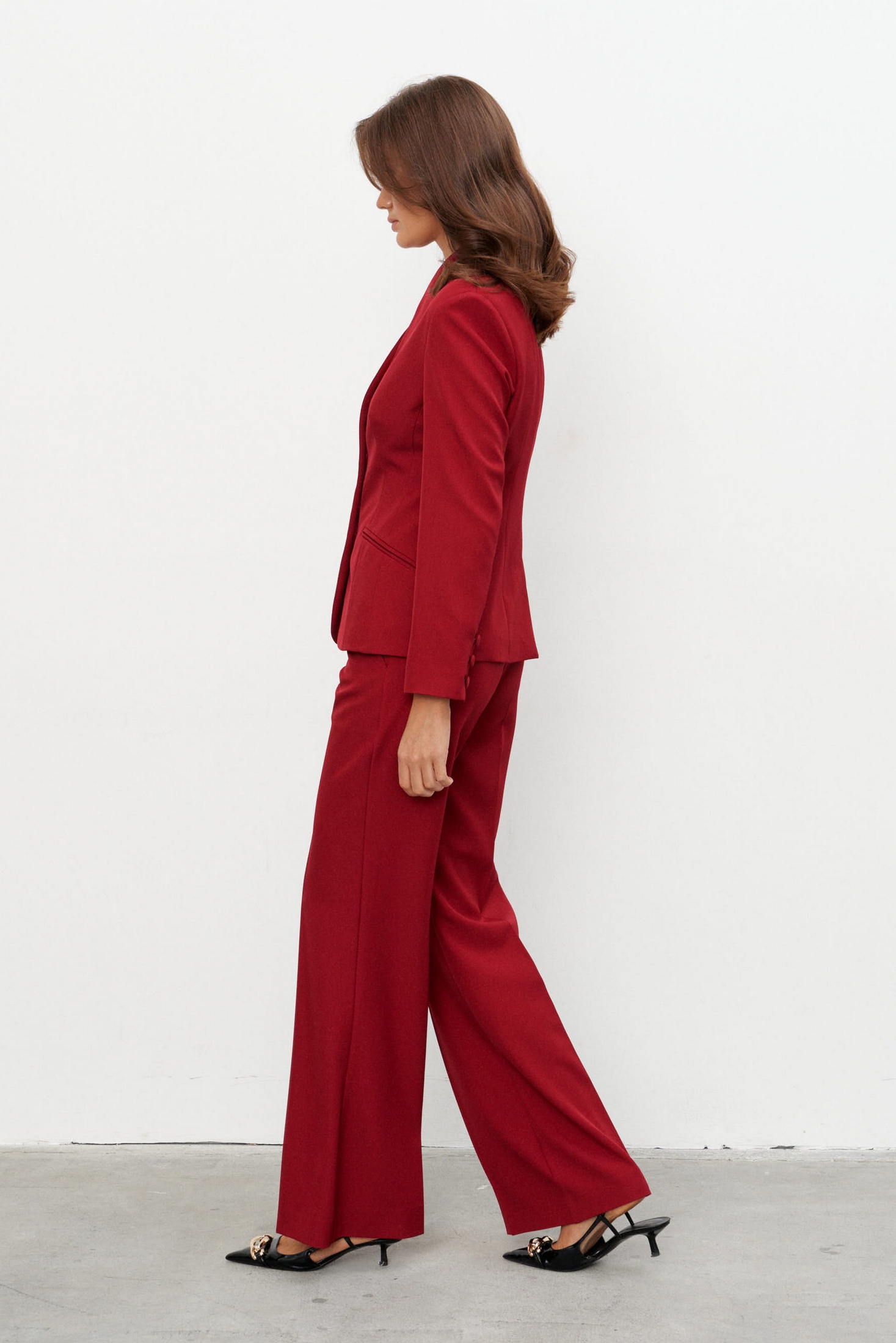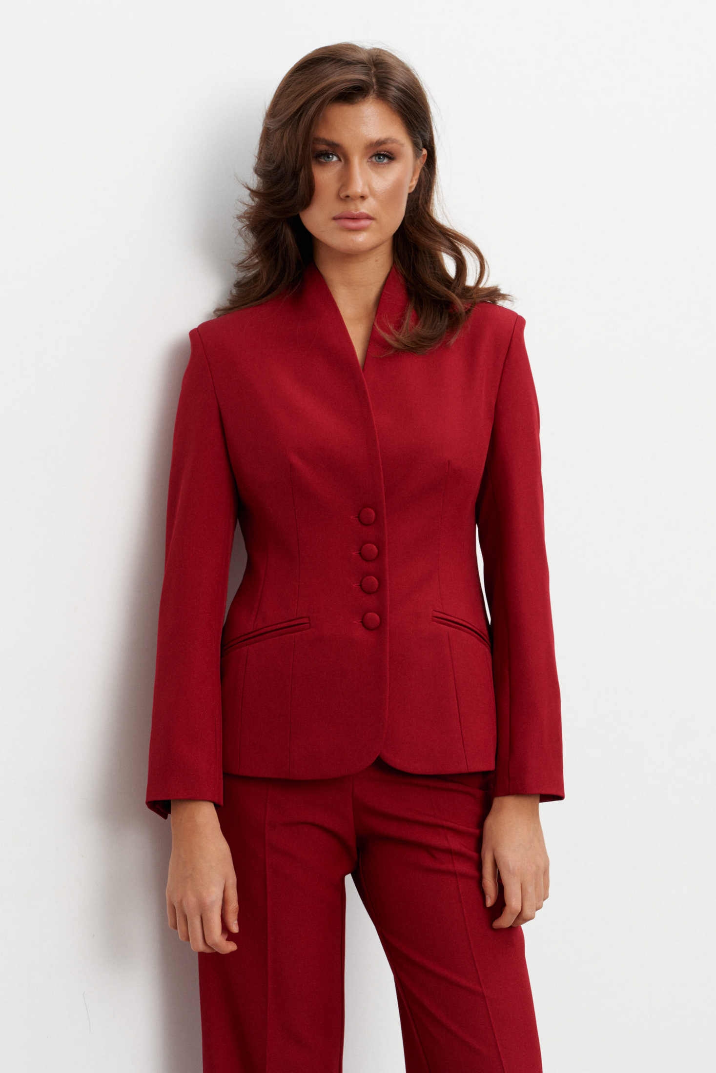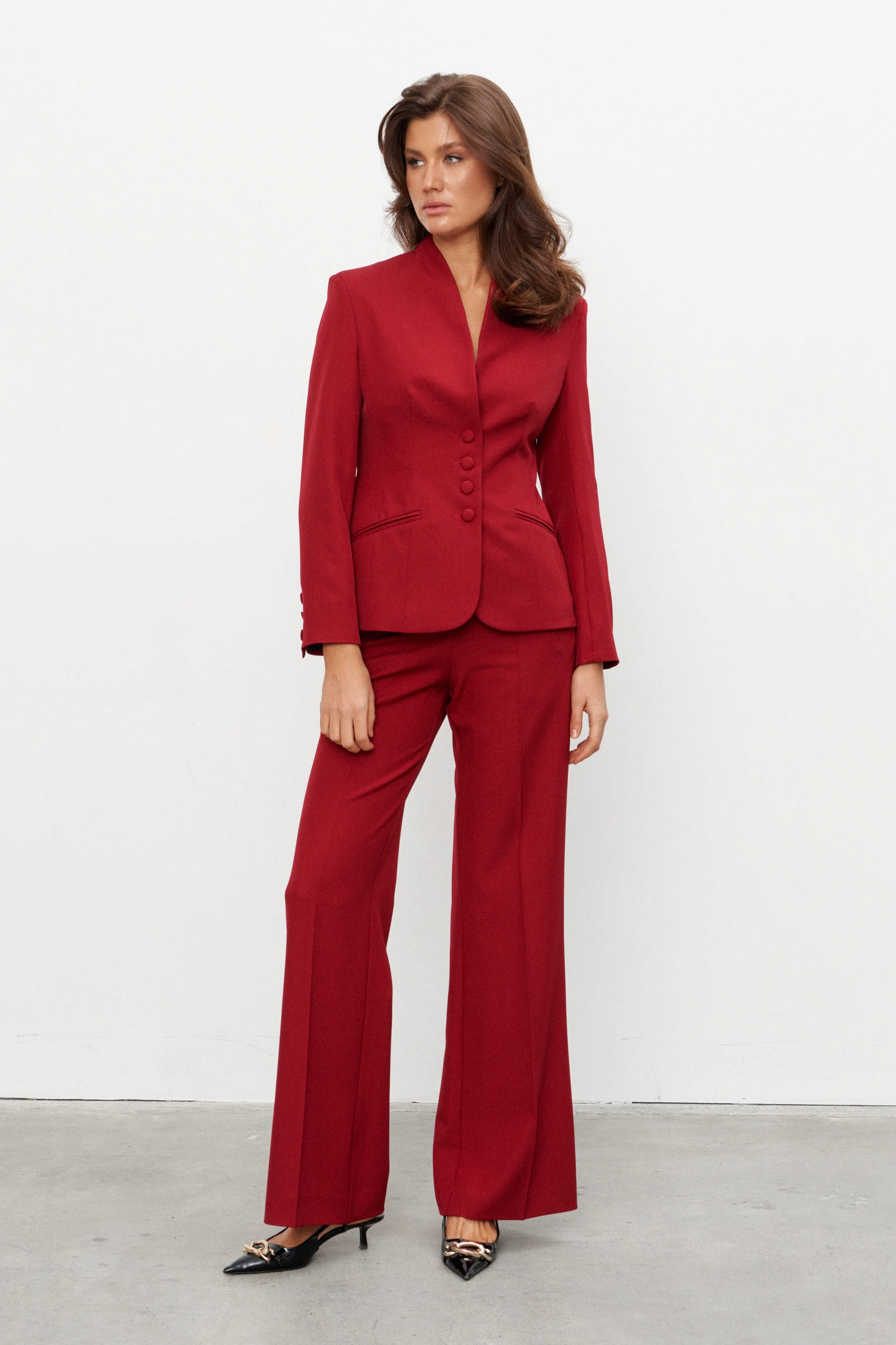Элегантный женский брючный костюм цвета бургунди — идеальный выбор для деловых и торжественных мероприятий. Костюм состоит из утонченного приталенного жакета и классических брюк. Жакет дополнен оригинальным воротником-стойкой, который плавно переходит в борта, создавая выразительный силуэт. Модель застегивается на ряд элегантных пуговиц, а на передней части расположены прорезные карманы в рамку, добавляющие функциональности. Рукава оформлены шлицами с пуговицами для добавления изысканности. Брюки, выполненные в классическом стиле, имеют карманы по бокам и слегка расклешенный крой, что придает изделию особую изящность и позволяет аккуратно сочетаться с обувью на каблуке. Этот костюм — отличный выбор для создания строгого, но женственного образа.