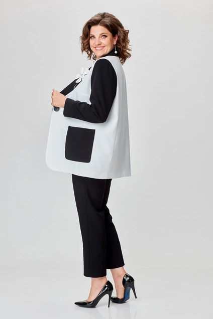 Жакет на подкладке, прямого силуэта, длиной чуть ниже линии бедер, с центральной застежкой на одну большую декоративную пуговицу, закругленными бортами по низу, воротником пиджачного типа и накладными карманами, повторяющими по низу закругленную форму борта. Рукав длинный. Оригинальность комплекту придает комбинирование в жакете 2-х цветов.