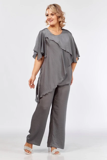 Нарядный женский комплект из легкой непрозрачной ткани с добавлением вискозы и шелка. Блузон свободного облегания, удлиненный, вырез горловины круглый, рукав короткий. Оригинальность блузону придает многослойность ассиметричных деталей. Брюки длинные, прямые, с карманами в боковых швах и отрезным поясом с резинкой.