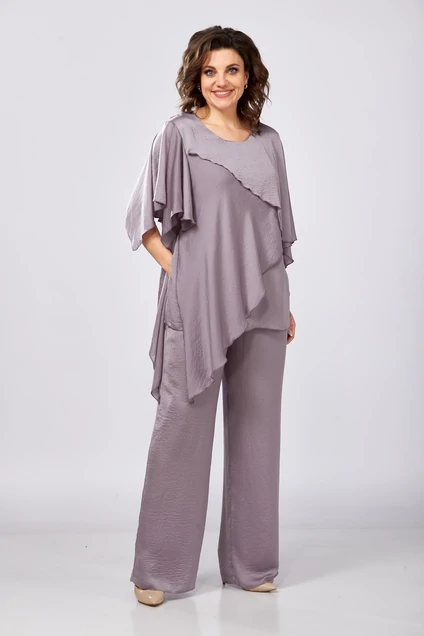 Нарядный женский комплект из легкой непрозрачной ткани с добавлением вискозы и шелка. Блузон свободного облегания, удлиненный, вырез горловины круглый, рукав короткий. Оригинальность блузону придает многослойность ассиметричных деталей. Брюки длинные, прямые, с карманами в боковых швах и отрезным поясом с резинкой.