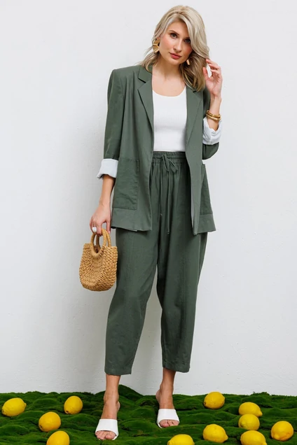 Комплект состоит из брюк и жакета. Жакет прямого кроя без застежки. По переду накладные карманы. По спинке 2 шлицы, которые можно расстегнуть для более легкого образа. Жакет на хлопковой подкладке. Льняные брюки свободного кроя. Пояс выполнен на резинке с шнуром внутри, для удобства носки и регулирования облегания по талии.По переду выполнен шов благодаря которому ваши ноги визуально будут стройнее и длиннее. В боковых швах расположены карманы.По заднему полотнищу расположены накладные карманы.Это лучший комплект для летнего сезона! Он подойдет для тех кто любит удобную и не сковывающую движения одежду. Материал из которого он выполнен позволит вашей коже дышать, он быстро сохнет и не катается после носки.Длина брюк 94 см.