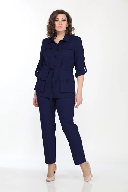 Костюм женский 2-ух предметный, состоящий из жакета и брюк, из костюмного материала. Жакет прямого силуэта, без подкладки, с нагрудными вытачками от боковых швов, удлиненный. Воротник рубашечного типа с острыми концами и отрезной стойкой. На деталях переда обработаны верхние накладные карманы с клапанами фигурной формы, застегивающимися на петлю и пуговицу, и нижними накладными карманами - "портфелями" прямоугольной формы с клапанами фигурной формы, застегивающимися также на петлю и пуговицу. Жакет с центральной застежкой на 6-ть петель и пуговиц. По краю борта, на расстоянии 5 см, проложена отделочная строчка, имитирующая планку. По плечевым швам, воротнику, кокетке, клапанам карманов проложены двойные отделочные строчки. Нижняя часть спинки цельная. По линии талии настрочена наружная кулиска с поясом из окантовки. Рукава втачные, длинные, одношовные, с патами фигурной формы, застегивающимися на петлю и пуговицу. Брюки прямого силуэта, частично на резинке, слегка зауженные книзу. Верхний край брюк обработан притачным поясом. Застежка по переду на тесьму - молнию и одну петлю и пуговицу. Передняя часть брюк со складками и наклонными карманами. Разрезы внизу в боковых швах. Задняя часть брюк с талиевыми вытачками и имитацией карманов "с листочкой". Размеры 48-52: длина жакета 73 см, длина рукава 60 см, длина брюк 99 см. Размеры 54-58: длина жакета 75 см, длина рукава 61 см, длина брюк 102 см