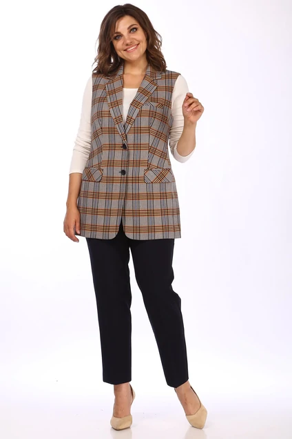 Костюм 2-х предметный, состоящий из жилета и брюк. Жилет удлиненный, на подкладке. Вырез горловины углубленный, V-образный, обработанный отложным воротником с цельнокроеными лацканами. Застежка центральная, бортовая на петли-пуговицы. Перед с бочками , переходящими на спинку карманами в рамку и клапанами. От рамки- талиевые вытачки. Спинка со средним швом. Брюки слегка зауженные к низу, на поясе, с застежкой на петли-пуговицы и гульфиком с застежкой-"молнией". По поясу шлевки. Размеры 48-52: длина жакета 75 см, длина брюк 99 см. размеры 54-58: длина жакета 75 см, длина брюк 101 см. Брюки: ПЭ 80%, вискоза 16%, ПУ 4%.