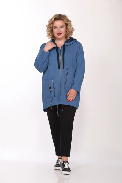 Брючный костюм в спортивном стиле выполнен из трикотажного полотна-трехнитка. Куртка удлиненная свободного силуэта с капюшоном, рукав на спущенной пройме, по полочке ассиметричные накладные карманы с множеством декоративных деталей (молния, полукольца, тесьма). Застежка молния. По низу куртки регулируемая кулиска. Брюки на резинке свободного силуэта , зауженные к низу ,по боковым швам декоративные лампасы.