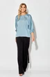 Блуза женская из атласной ткани, свободного силуэта, длиной до линии бедер, с цельнокроеными рукавами, в боковых швах обработаны разрезы, со съемным декоративным поясом. На детали переда блузы вверху слева нанесена аппликация-печать и прикреплены декоративные «камни». Деталь спинки со средним швом, вверху обработан разрез с застежкой на 1 пуговицу и навесную петлю. Рукава цельнокроеные, длиной 7/8, понизу вставлена эластичная тесьма. Вырез горловины округлой формы, обработан обтачкой.