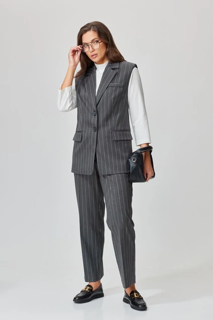 Комплект женский 3-х предметный (жилет, джемпер и брюки). Жилет женский, полуприлегающего силуэта, на подкладке, длиной ниже линии бедер, с втачным воротником, с центральной сквозной застежкой на 2 петли и 2 пуговицы до линии перегиба лацкана. Детали переда жилета с отрезными бочками, горизонтально расположенными боковыми прорезными карманами с листочками и с клапанами, и талиевыми вытачками от разрезов карманов, на левой детали вверху расположена листочка с настрочными концами. Деталь спинки жакета с рельефными швами и плечевыми вытачками, со средним швом. Воротник отложной пиджачного типа. Углы воротника и лацканов острые. Края воротника, лацкана, борта, обработаны в чистый край. Жилет с притачной понизу подкладкой. Джемпер женский, свободного силуэта, длиной до линии бедер, с втачными рукавами, с втачной стойкой по горловине. Брюки на бедрах, плотно облегающие вверху и зауженные к низу, с притачным поясом, по спинке пояса вставлена эластичная тесьма. В боковых швах обработаны карманы. На передних и задних половинках брюк заутюжены «канты». На поясе прикреплены 5 шлёвок. Декор может отличаться от представленного на фотографии. Джемпер: вискоза - 60%, нейлон - 30%, спандекс - 5%