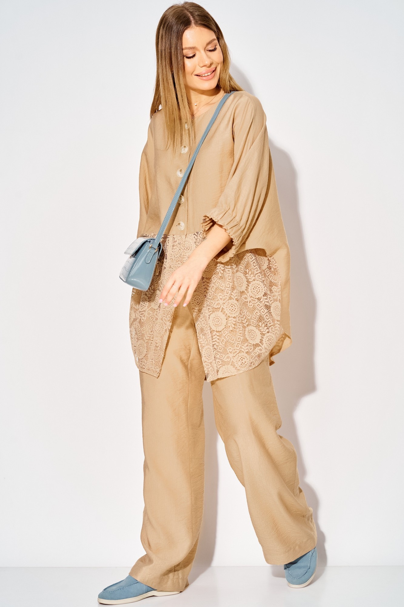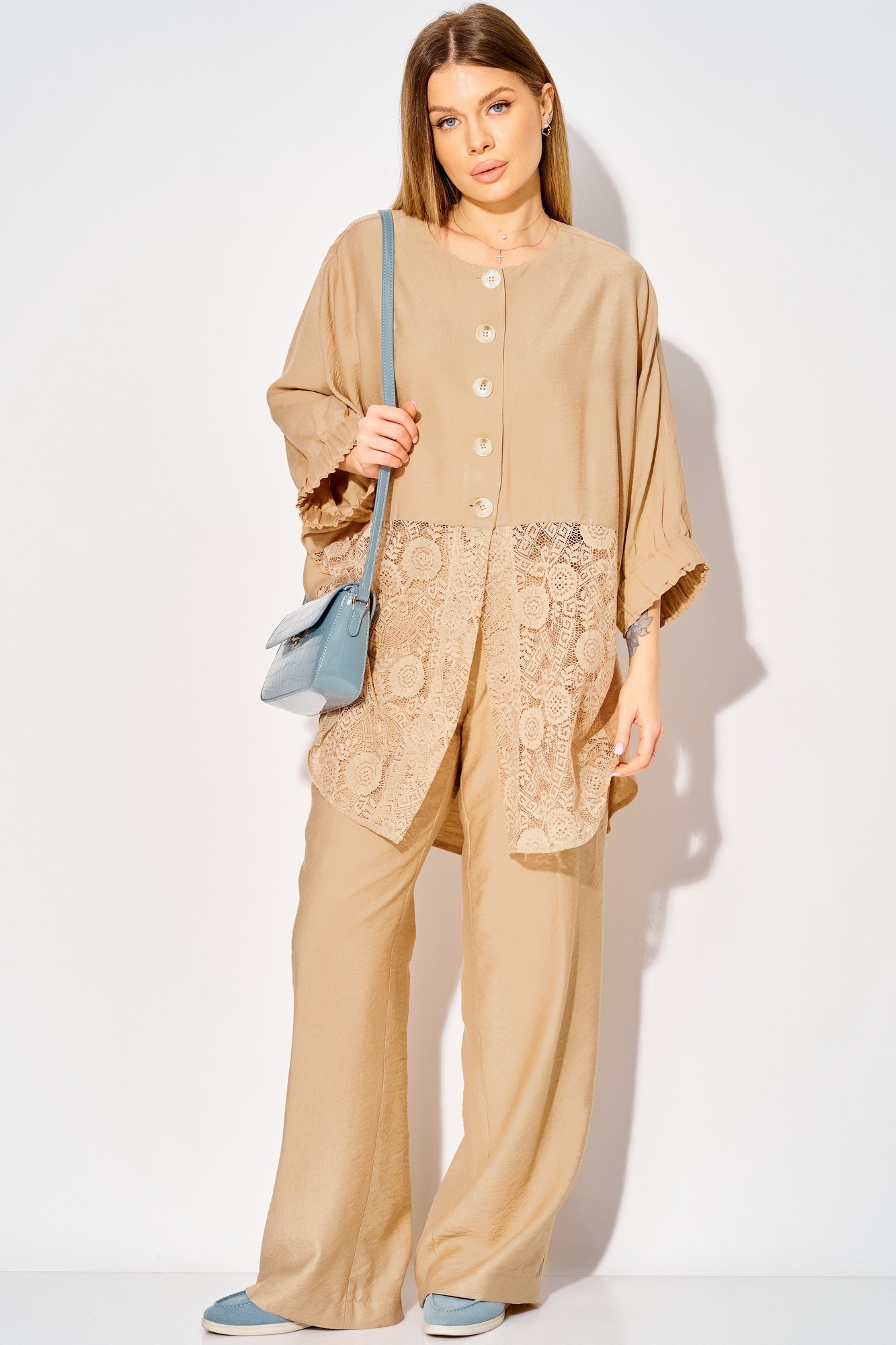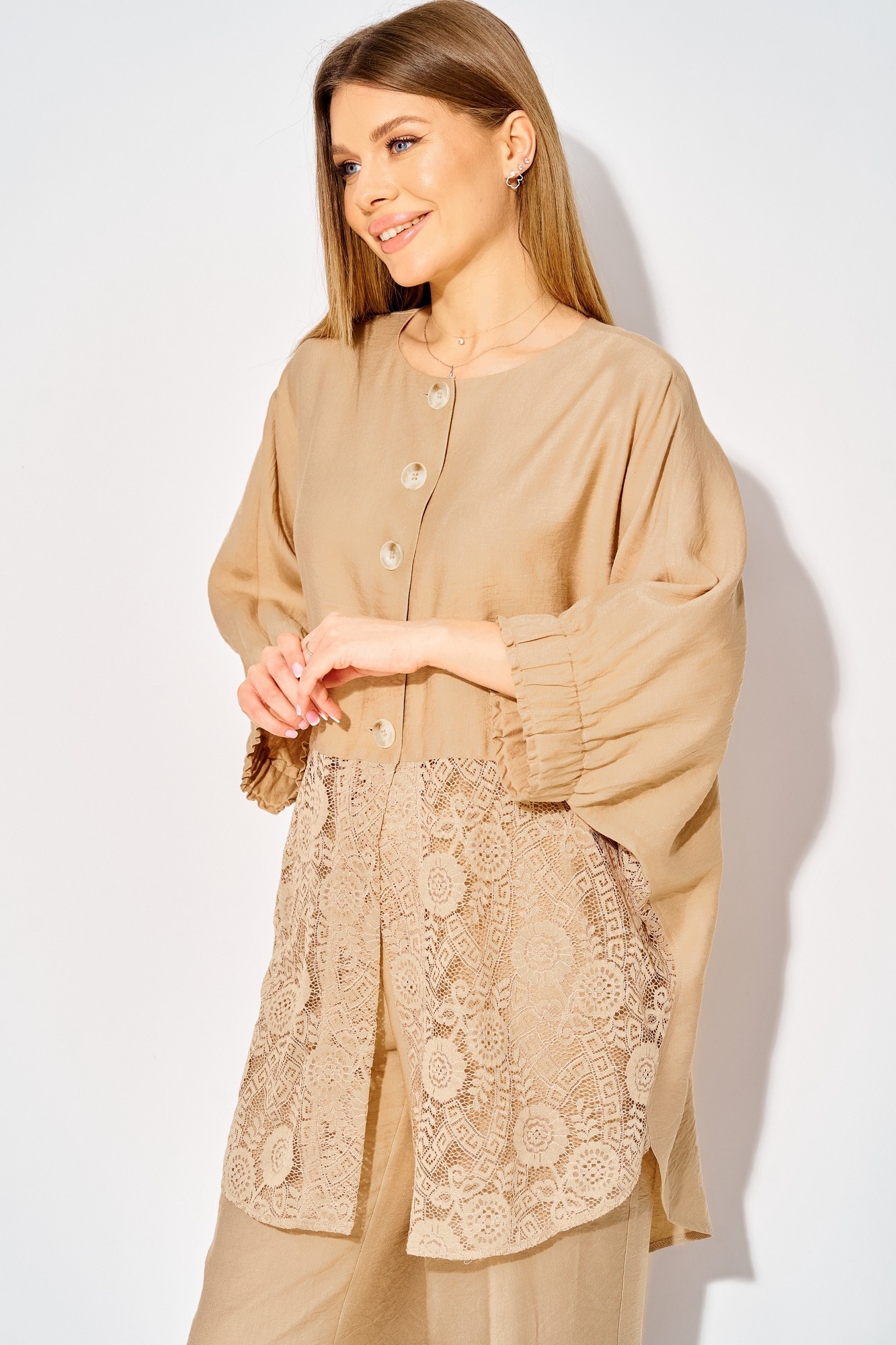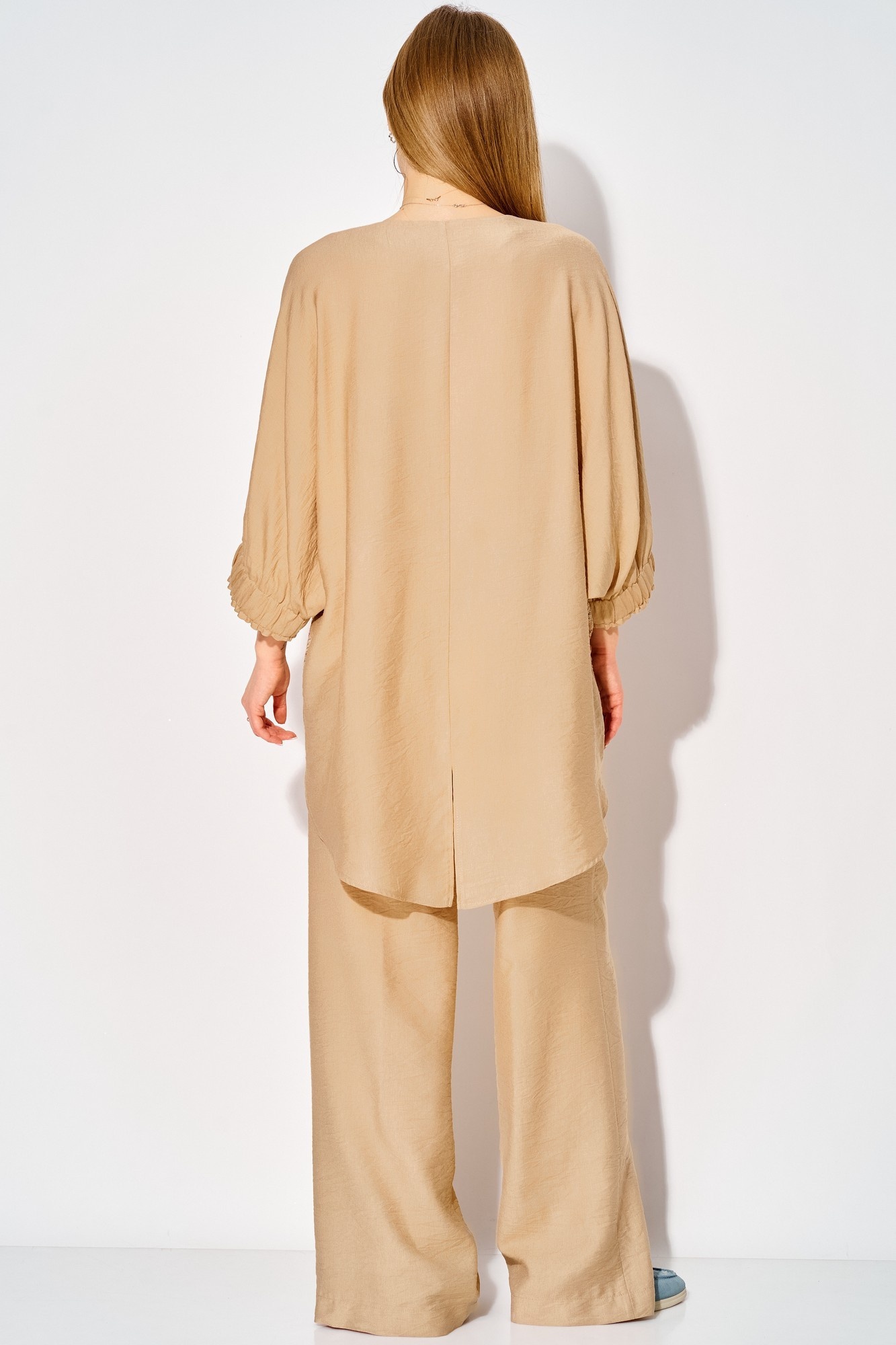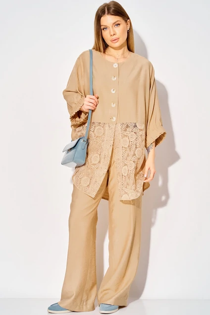 Костюм брючный 534 бежевый LAIKONY — идеальное решение для создания стильного летнего образа. Коллекция бренда LAIKONY предлагает удобный комплект, состоящий из туники и брюк. Изготовленный из мягкой вискозы, костюм гарантирует комфорт и легкость в носке. Свободный силуэт туники с асимметричным низом и кружевной вставкой по полочке придает облику утонченность и оригинальность. Округлый вырез горловины и цельнокроеные рукава, собранные на широкую резинку, создают современный повседневный стиль. Туника длиной по спинке 86 см и рукавами 53 см гармонично сочетается с прямыми брюками длиной 105 см. Карманы в боковых швах и эластичная тесьма на поясе обеспечивают практичность и идеальную посадку. Этот бежевый комплект подходит для теплых летних прогулок, подчеркивая вашу индивидуальность.