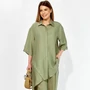 Комплект женский (жакет и брюки). Жакет женский, свободного силуэта, на подкладке, длиной ниже линии бедер, с втачными рукавами, с центральной сквозной застежкой на 2 петли и 2 пуговицы до линии перегиба лацкана, со съемным поясом. Детали переда жакета с отрезными бочками, с вертикальными нагрудными вытачками, переходящие в боковые швы, с накладными карманами и с цельнокроеными клапанами. Деталь спинки жакета с рельефными швами и со средним швом. Рукава втачные двухшовные, с передним и локтевым швами, внизу локтевых швов обработана шлица и декоративно прикреплены по 2 пуговицы. Воротник отложной пиджачного типа. Углы воротника и лацканов острые. Края воротника, лацкана, борта, клапанов обработаны в чистый край. Жакет с притачной понизу подкладкой. Брюки на бедрах, плотно облегающие вверху и прямые к низу, с притачным поясом, по спинке в пояс вставлена эластичная тесьма. Застежка на тесьму-молнию и 1 потайной крючок. В боковых швах обработаны наклонные карманы. На задних половинках брюк обработаны по 1 вытачке. На передних и задних половинках брюк заутюжены «канты». На поясе прикреплены 5 шлёвок. Декор может отличаться от представленного на фотографии. Жакет: длина спинки – 73см. Брюки: длина по боковому шву – 104см. Жакет: длина рукава - 62см, ширина рукава – 20см.