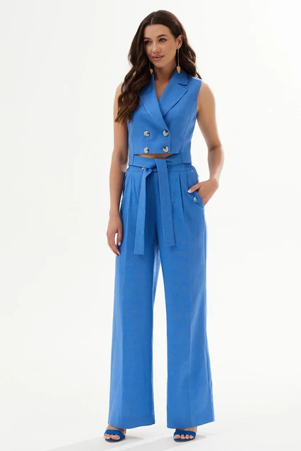 Молодежный комплект выполнен из натуральной ткани. Короткий жилет с отложным воротником и лацканами. Двубортная застежка на пуговицы. Впереди рельефы и вытачки, притачной отложной пояс, завязывается на узел. По спинке шов и рельефы, внизу притачной пояс. Брюки длинные, прямые, оформлены притачным поясом (на талии), по бокам резинки. Застежка «молния» и пуговицы. У боковых швов внутренние карманы с клапанами и пуговицами.