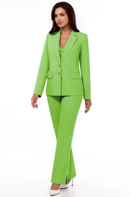 Жакет средней длины, полуприлегающего силуэта, выполнен на основе классического кроя. Впереди рельефы от проймы, отложной воротник и лацканы, застежка на две пуговицы, внутренние карманы "в рамочку" + клапан. По спинке центральный шов и рельефы от проймы. Рукав длинный, на шлице четыре пуговицы. Жакет на подкладке. Брюки длинные, прямые, внизу по боковым швам высокие шлицы, что придает брюкам зрительно небольшое расширение. Сверху притачной пояс с резинкой у боковых швов, застежка "молния" + пуговица.