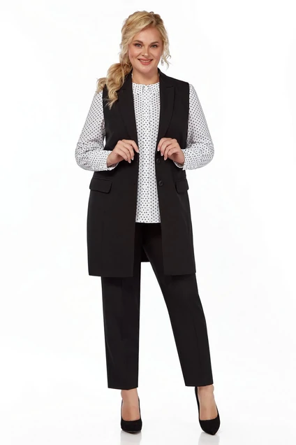 Комплект двухпредметный: жилет, брюки. Удлиненный жилет полуприлегающего силуэта, с отложным воротником и лацканами, застежка на две пуговицы. Впереди рельефы от пройм, внутренние карманы «в рамочку» +клапаны, которые можно спрятать. По спинке шов и рельефы. Жилет на подкладке «Гранд». Брюки заужены к низу, оформлены притачным поясом (по бокам резинки), застежка «молния» + пуговица