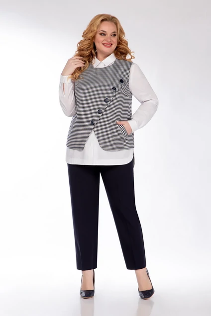 Модный и удобный комплект для офиса трехпредметный: рубашка, жилет, брюки. Рубашка из х/б ткани прямого силуэта, впереди нагрудные вытачки, воротник на стойке, застежка на пуговицы. По спинке кокетка, у кокетки заложены складки. Спинка чуть ниже переда. По боковым швам -закругленные разрезы. Рукав длинный, с притачной манжетой на пуговице. Слегка укороченный жилет прямого силуэта выполнен из костюмной ткани с модным мелким рисунком жаккардового переплетения, на подкладке. Впереди нагрудные вытачки, имитация застежки с пуговицами, по центру – разрез с закругленными краями, внутренние карманы с листочками. По спинке центральный шов и застежка «молния». Жилет теплый, удобный, не стесняет движения, есть куда положить телефон или платок. Брюки длинные, классического кроя, оформлены притачным поясом (по бокам резинки), застежка «молния» + пуговица. Длина жилета сзади по спинке 62 см. Длина рубашки сзади по спинке 74 см, длина рукава 63 см. Длина брюк по боковому шву 97 см. Состав ткани жилета: 65% ПЭ, 32% вискоза, 3% спандекс.Состав ткани брюк: 65% вискоза, 35% ПЭ.