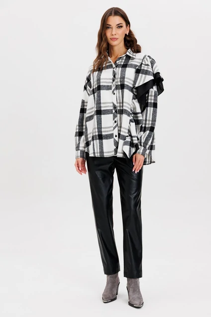 Стильный комплект из свободной блузы рубашечного кроя с воланами, расположенными вертикально на одной из сторон изделия и полуоблегающих брюк из экокожи с поясом корсетного типа.
