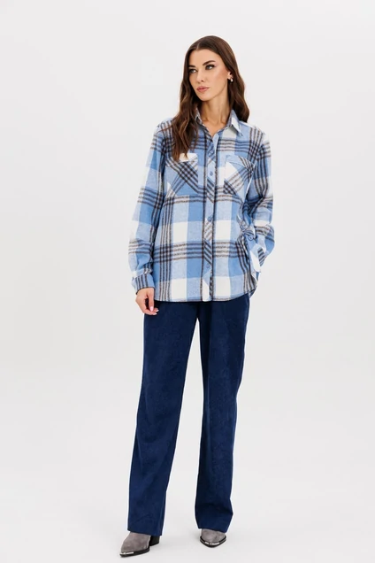 Стильный комплект, состоящий из свободной рубашки принт: клетка с планками по бокам, накладными карманами и свободных брюк из фактурной ткани, имитирующий вельвет.