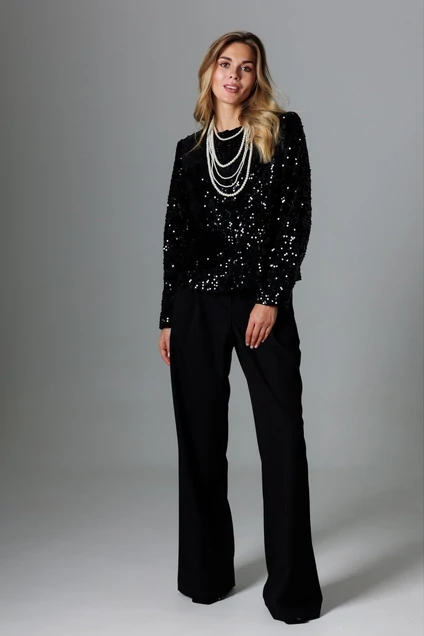 Элегантный брючный комплект, состоящий из жакета из мягкого трикотажного полотна велюр с пайетками и свободных брюк в стиле палаццо из текстильной ткани.